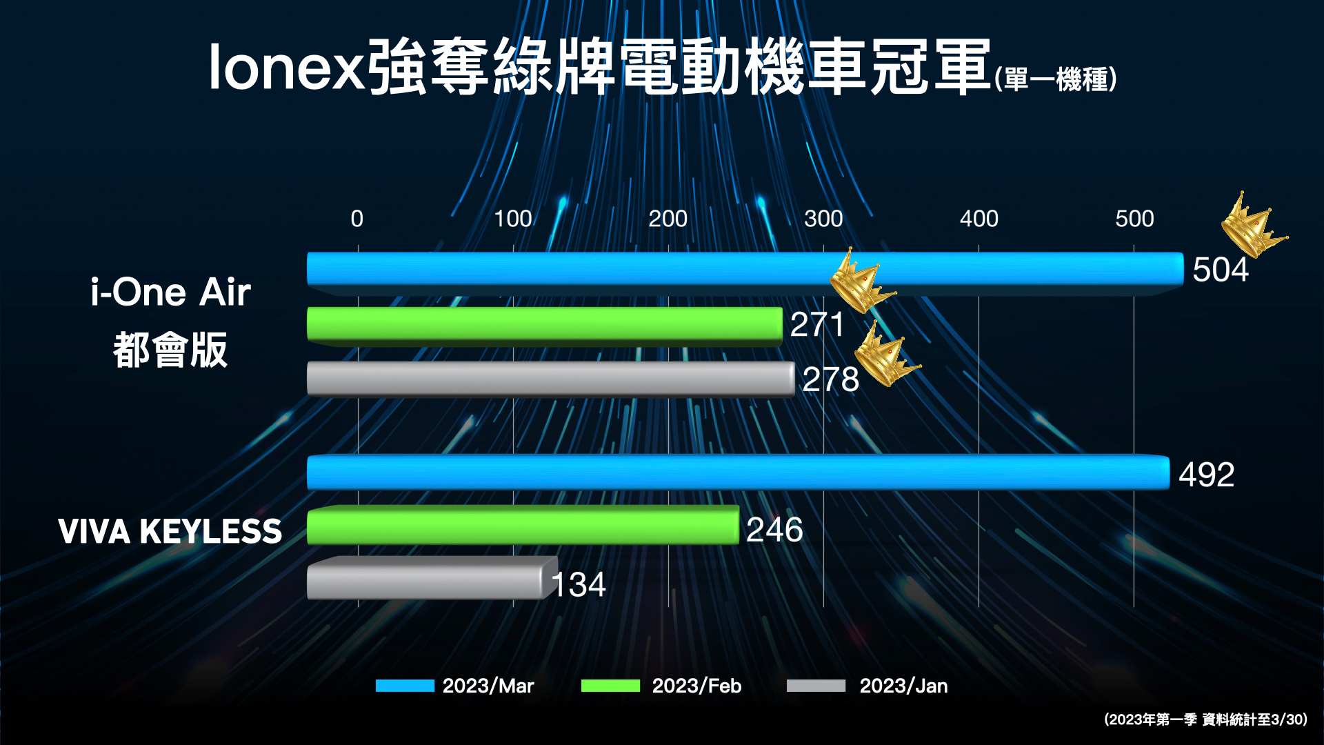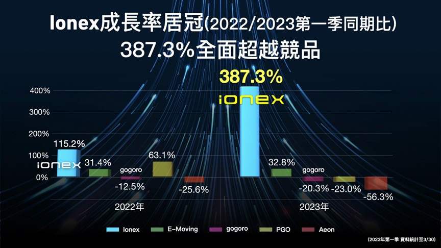 延續2022年飆升的買氣,Ionex於2023年開春迄今銷售能量依舊不減,且隨著每個月持續上揚,1月銷售總量為684台,2月銷售成績為727台,3月至30日為止就已達成1,508台。比對3月與2月單月成績,銷售量足足提升781台、市占率增加6.1%,成長率高達46%多。不僅如此,從1月至3月30日止,Ionex累積了2,919台銷售總量,相較於去年同期增加了2,320台之多,市占率增加14.6%,銷售量成長率更達387.3%;從去 (2022) 年開始,Ionex即站穩台灣電動機車品牌亞軍位置,以坐二望一姿態,朝集團董事長柯勝峯所指出的油電雙料冠軍目標積極邁進。