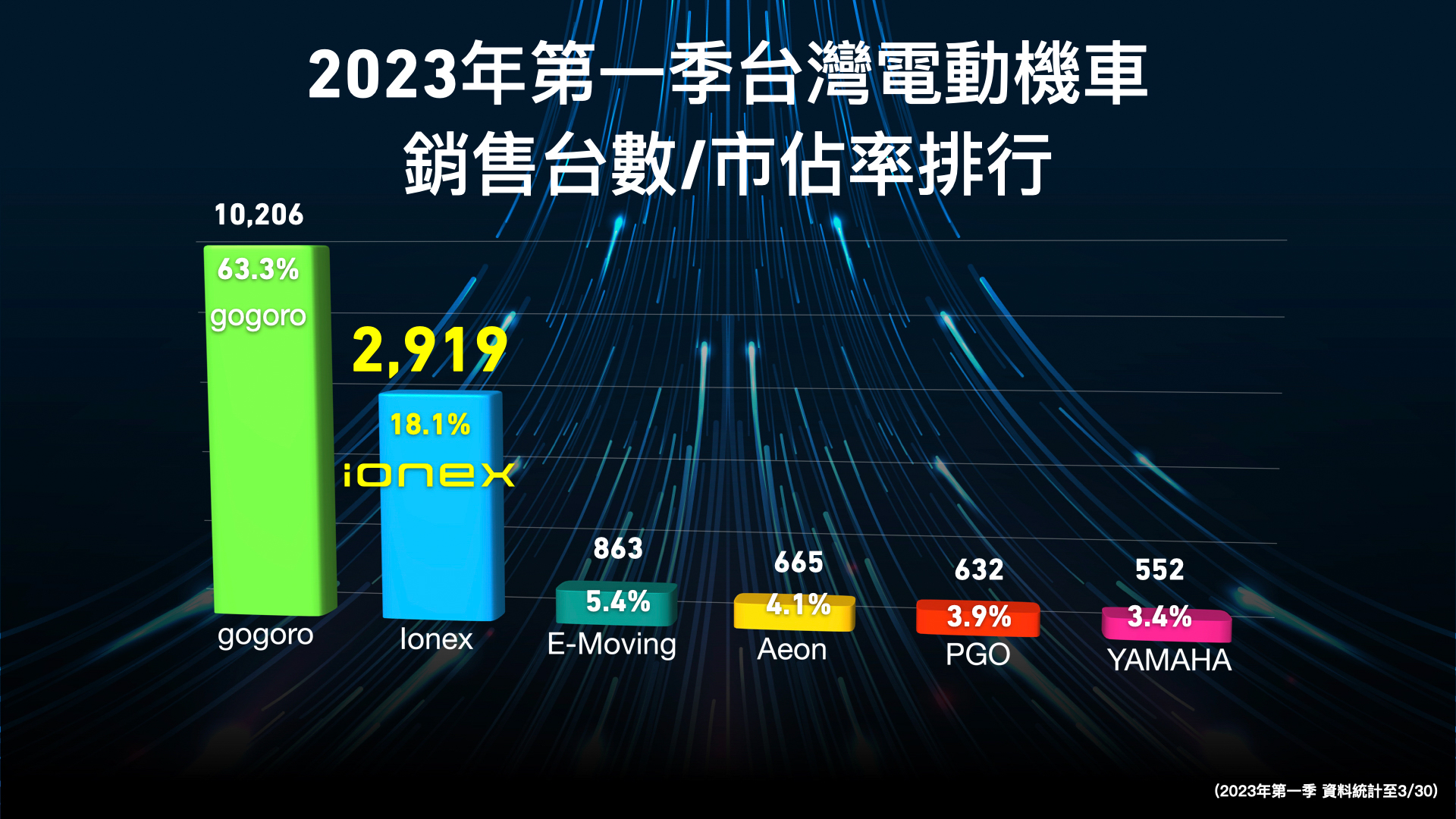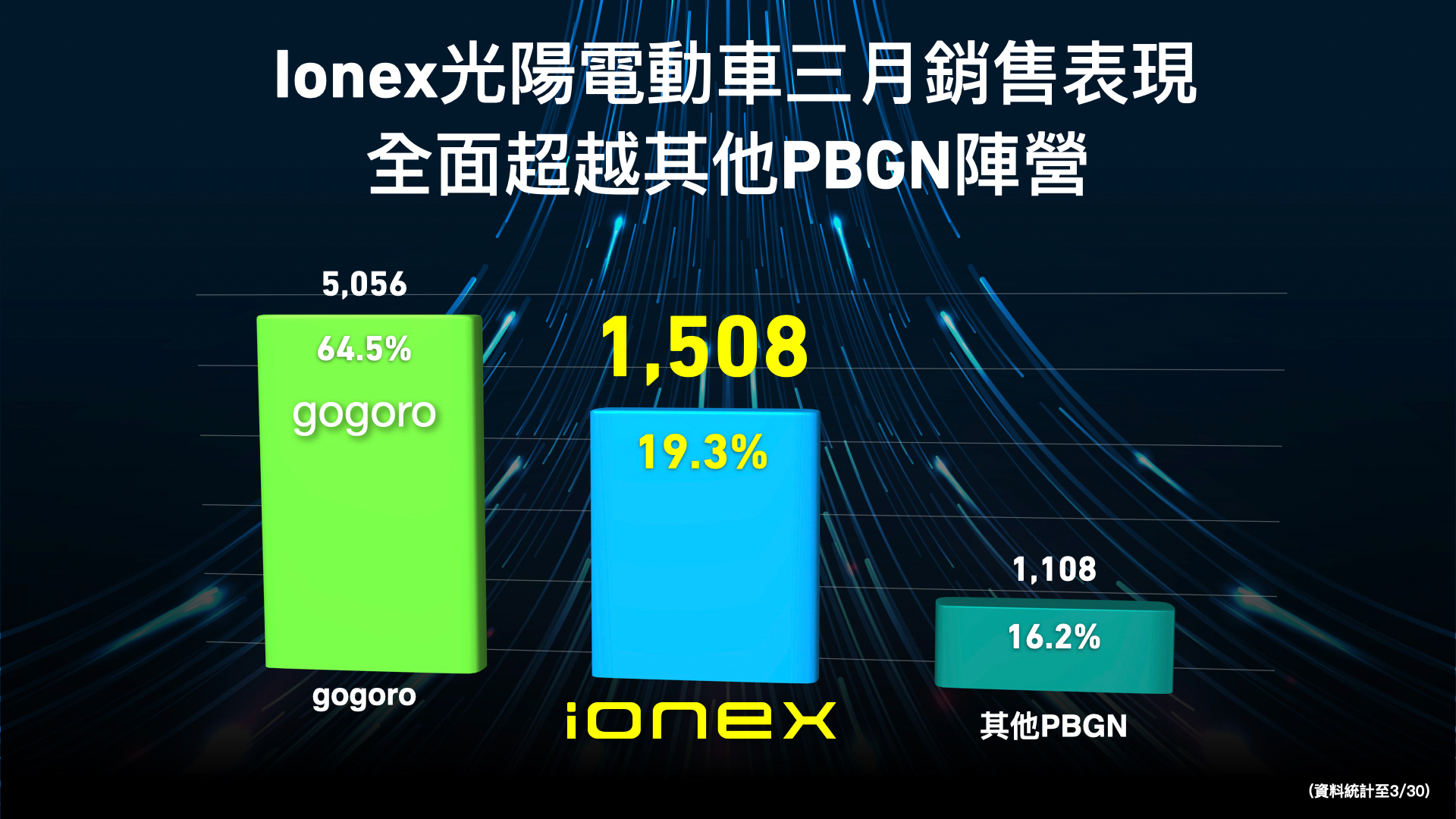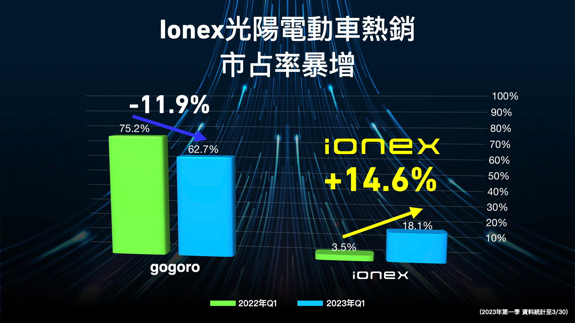 Ionex於1月至3月30日期間對比去年同期所成長的14.6%市占率,恰為同業所萎縮的11.9%市占率,市場版圖移動趨勢明顯,位居亞軍Ionex光陽電動車與冠軍同業品牌加總已超過八成的市占率,其他品牌難起如此明顯影響,兩品牌間的市占率轉移不由分說。