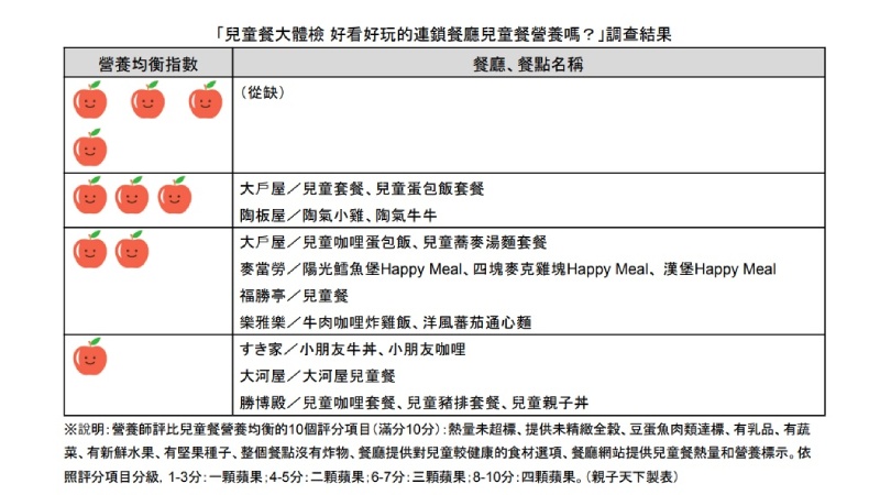 然而在本次檢測中,「沒有任何一套」兒童餐提供足量的蔬菜,甚至有8套兒童餐是「一片青菜都沒有」。許多兒童餐提供「濃縮還原果汁」,但在新鮮水果的供應上,同樣「沒有任何一套」兒童餐提供足夠份量的新鮮水果。