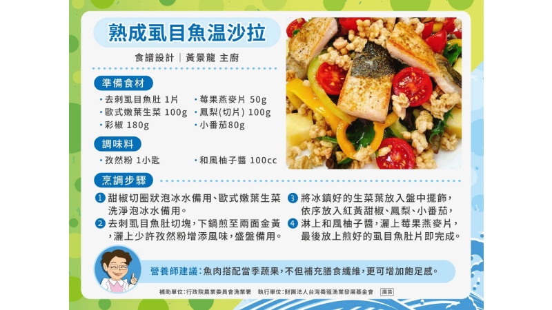 漁業署在臉書粉專「行政院農業委員會漁業署」發文表示,春季想要清爽健康飲食,可以用各種原型食物為健康打底。虱目魚肚可以補充優質蛋白質以及好油脂(Omega-3),加入各種自己喜愛的生菜、水果以及堅果,再拌入煎好的魚肚、淋上和風柚子醬,美味爽口的虱目魚肚溫沙拉就能上桌。