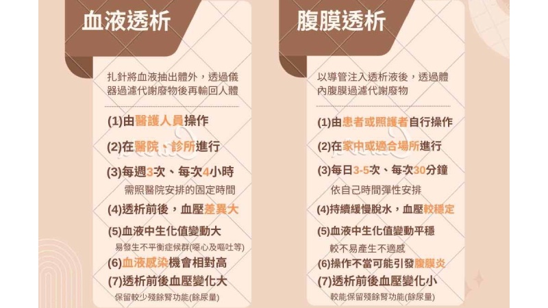 為了讓體內「排毒」功能正常進行,需要進行腎臟替代療法,方式有三種:腎臟移植、血液透析、腹膜透析。後兩者就是所謂的「洗腎」,原理相近,患者可依個人生活型態、習慣或需求來選擇。