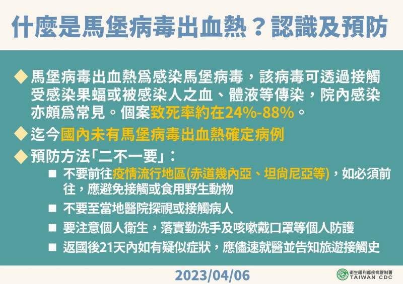 目前台灣將「馬堡病毒出血熱」與COVID-19、伊波拉病毒感染等,共同列為第五類法定傳染病。雖然目前國內尚未出現馬堡病毒出血熱確定病例,且疫情發生地區較偏遠,對國人威脅性低,但疾管署呼籲民眾應遵守「二不一要」: