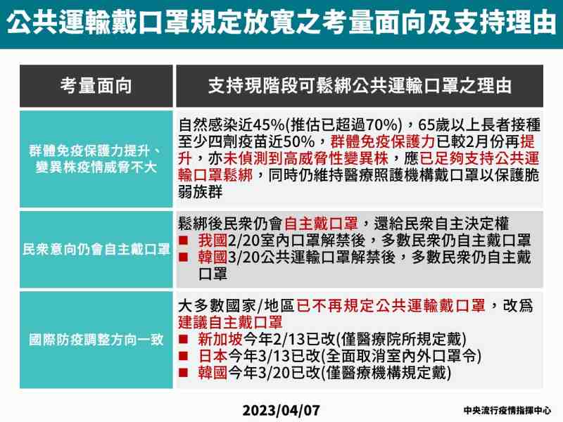 此外,COVID-19國內外疫情逐漸趨緩,清明連假後國內疫情仍持續穩定,醫療量能也相當充足,因此指揮中心決定放寬公共運輸口罩規定。