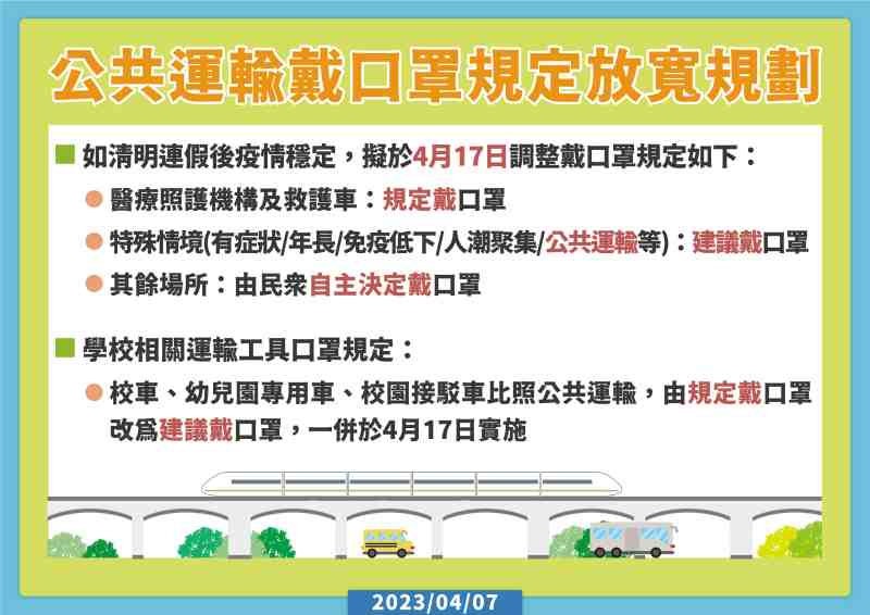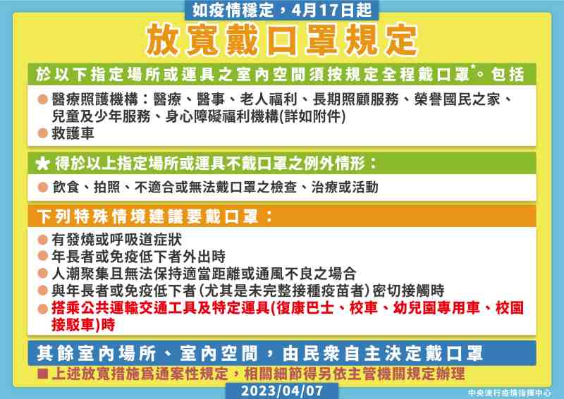 經綜合評估與跨部會溝通研議後,指揮中心宣布,若疫情持續穩定可控,自4月17日起,搭乘公共運輸交通工具及特定運具(復康巴士、校車、幼兒園專用車、校園接駁車)時不再強制佩戴口罩,改為「建議配戴口罩」。而公共運輸場站也將由強制佩戴口罩,改為「自主決定戴口罩」,但若逢年過節、人潮聚集無法維持適當距離時,也屬於建議配戴口罩的特殊情境。
