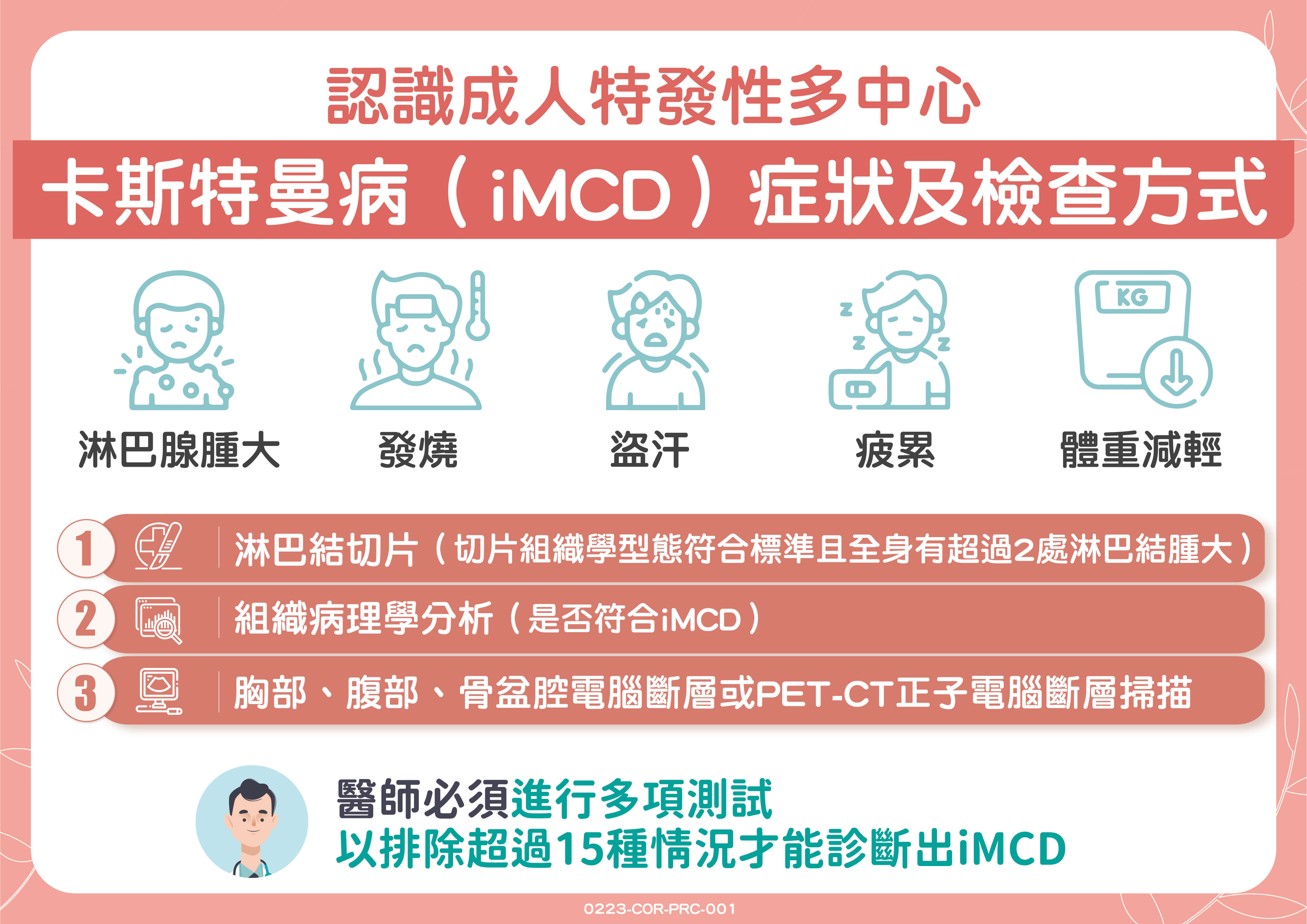 而特發性多中心卡斯特曼病因為症狀多元,患者一開始並不會直接到血液腫瘤科就診,往往是先到其他專科求診。王銘崇醫師強調,根據診斷指引,最重要的檢查為淋巴結切片,醫師也會再透過組織病理學分析,看是否符合卡斯特曼病;再透過全身詳細檢查是否屬於特發性多中心卡斯特曼病。