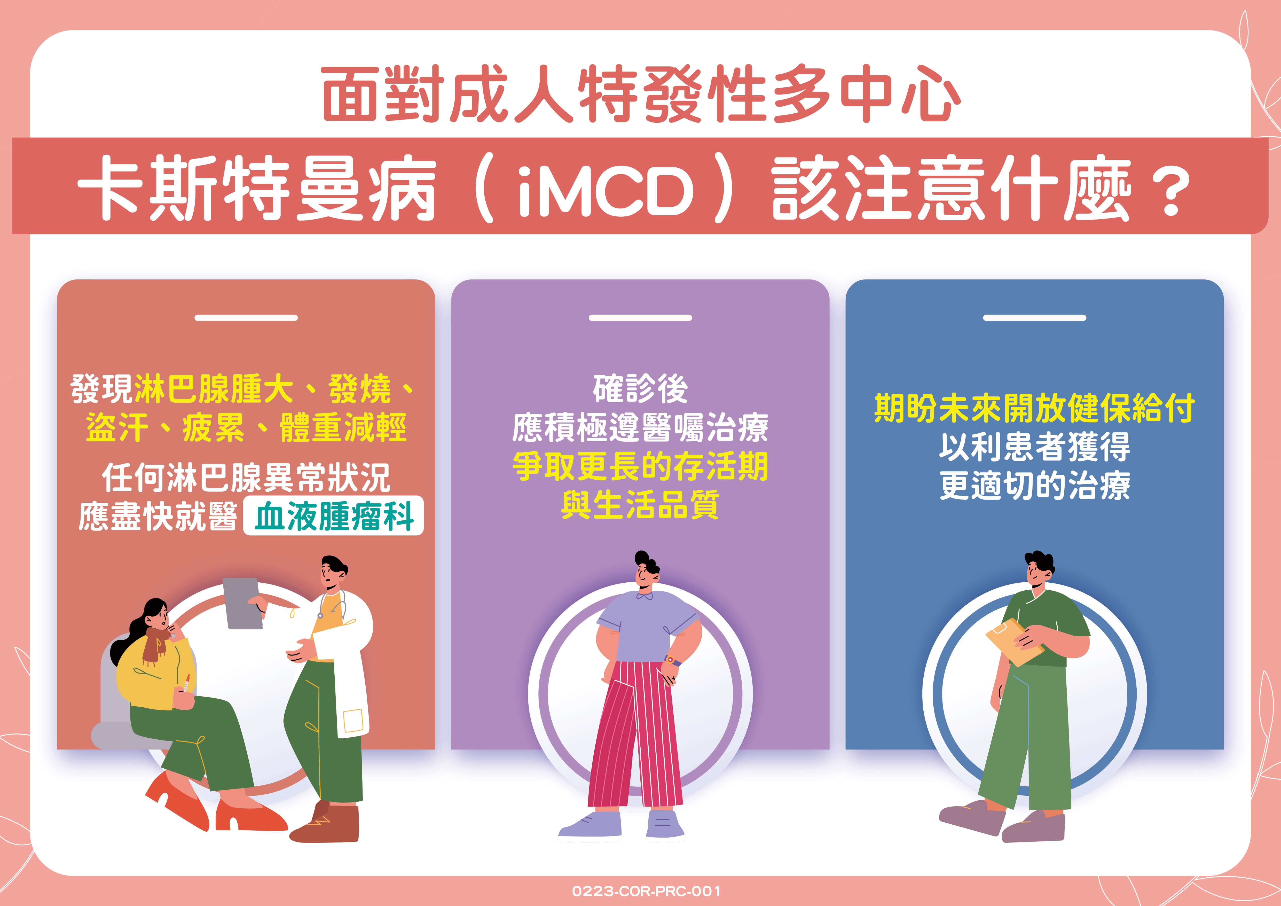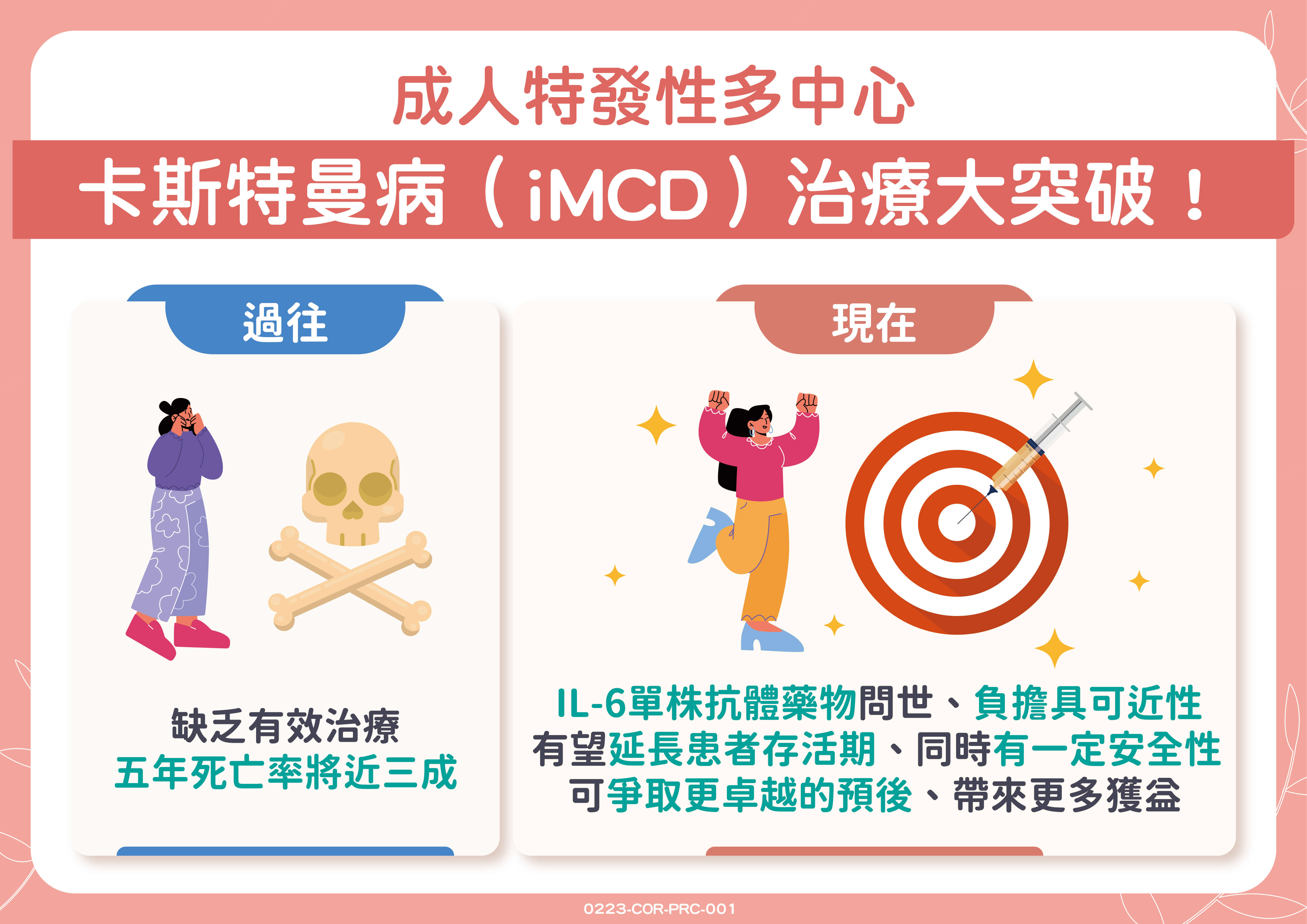 過去國內缺乏用於卡斯特曼病具有臨床實證的治療藥品,多以類固醇等傳統治療方式,但治療效果仍有需要加強的空間,五年死亡率將近三成,讓患者難以擺脫陰霾。所幸現今有了經過臨床試驗證實的IL6單株抗體藥物,有望延長存活、爭取更卓越的預後。呼籲特發性多中心卡斯特曼病患者,確診後應積極遵照醫囑接受治療。也期盼政府看見少數但可能致命的患者需求,能及早開放健保給付,以利患者獲得更適切的治療。