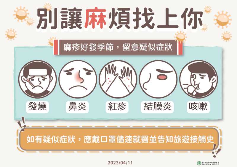疾管署4月11日公布,國內新增1例境外移入麻疹病例,為北部30多歲男性,今(2023)年3月17日至22日至泰國旅遊,4月3日發燒,4月5日出現紅疹等症狀,於4月5日就醫並住院隔離治療,經通報檢驗於4月11日確診。目前,個案已出院返家,其密切接觸者均無疑似症狀,衛生單位已初步掌握個案接觸者共36人(含醫療院所接觸者32人),將監測至4月23日。