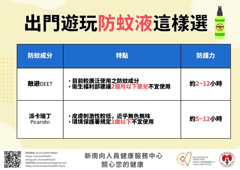 由於3種傳染病都是由蚊子叮咬傳播,新南向人員健康服務中心執行長彭仁奎呼籲,國人赴東南亞國家旅遊期間,於戶外活動時,應穿著淺色長袖衣褲、包鞋及長襪,儘量減少裸露部位,並正確使用含敵避(DEET)成分的防蚊蟲藥劑,預防病媒蚊叮咬。