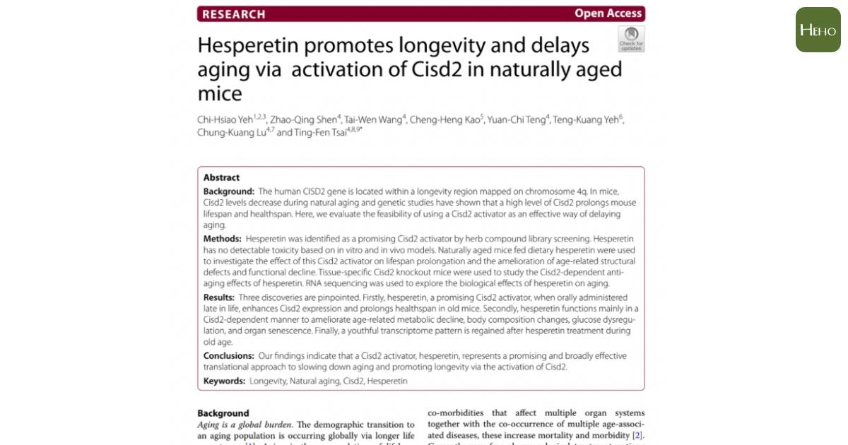 團隊發現小鼠在 21.5 月大 (相當於人類約 70 歲) 時餵食橙皮素後,到了 26.5 個月 (相當於人類約 80 歲) 時,竟能提升約 3 倍的 CISD2 表現量,證實橙皮素就是 CISD2 長壽基因促進劑。