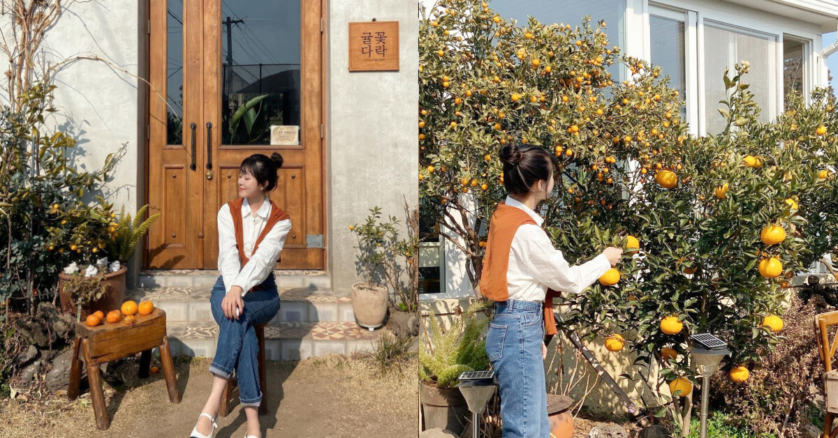 首先要介紹的是Cafe Tangerine Flower Attic,這家位於西歸浦的咖啡廳,最大的特點就是園區內有滿滿一大片濟州島最有名的橘子園,每當橘子盛產的時候,綠色的樹叢搭配閃著橘黃色澤的一顆顆橘子,實在是可愛到不行,隨便一拍都是美到炸的網美照!不過這裡的橘子僅供拍照,沒有提供摘採體驗的服務,大家到訪的時候也要小心拍照的時候不要把橘子弄掉囉!