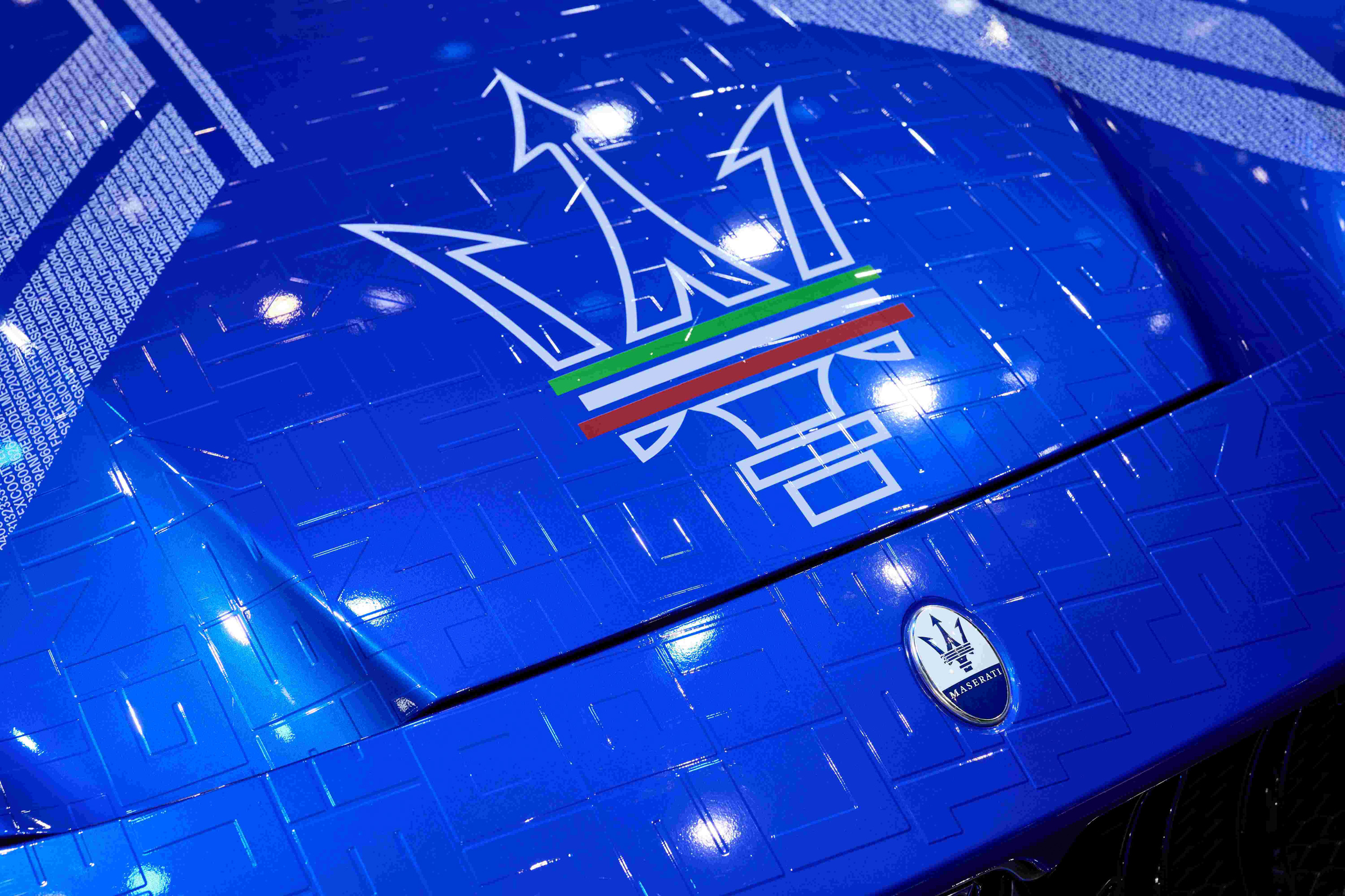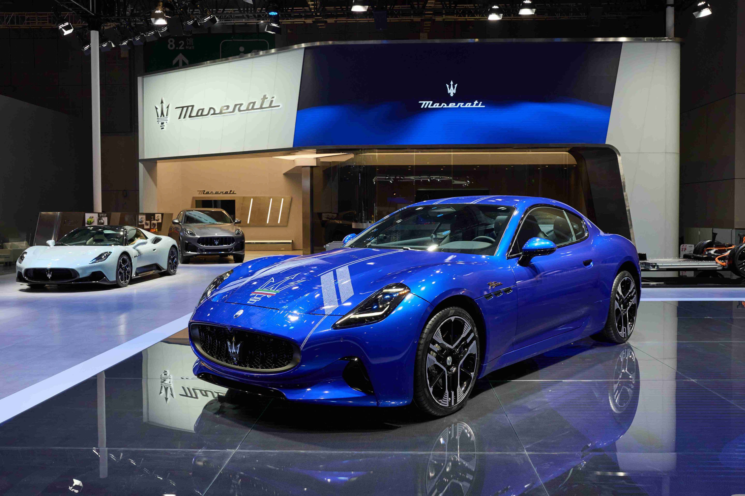 繼承了Maserati品牌一貫驚艷的優雅外觀,全新GranTurismo純電跑車樹立了獨具一格的全新造型 — 獨特的一體式前艙蓋和車身主體由四個葉子板連接,並進一步強調車身比例。車頂線條傾瀉而下,再度強化鐫刻有三叉戟標誌的 C 柱曲線,展現流暢靈動感。全新 GranTurismo 採用前後異徑輪胎配置,後輪尺寸較大,為(21 吋 295/30), 前輪(20 吋 265/35),旨在實現優異的空氣動力學表現,將Maserati引以為傲的極致性能推向頂峰;鑽石切割高光輪邊、純電版專屬擾流器、及前擴散器,使整車的風阻係數優化了約7%,有助於增加其續航里程,而純電版本專屬的進氣口,在彰顯個性身份的同時,更可減少輪拱內部的噪音。車展現場,全新GranTurismo純電雙門GT轎跑以經典藍(Blu 190 victories livery)塗裝展出,獨特的車身線條,更將自1926年至2012年間的品牌傳奇賽車手之名與勝利榮耀之日悉數呈現,讓人領略王者風采。