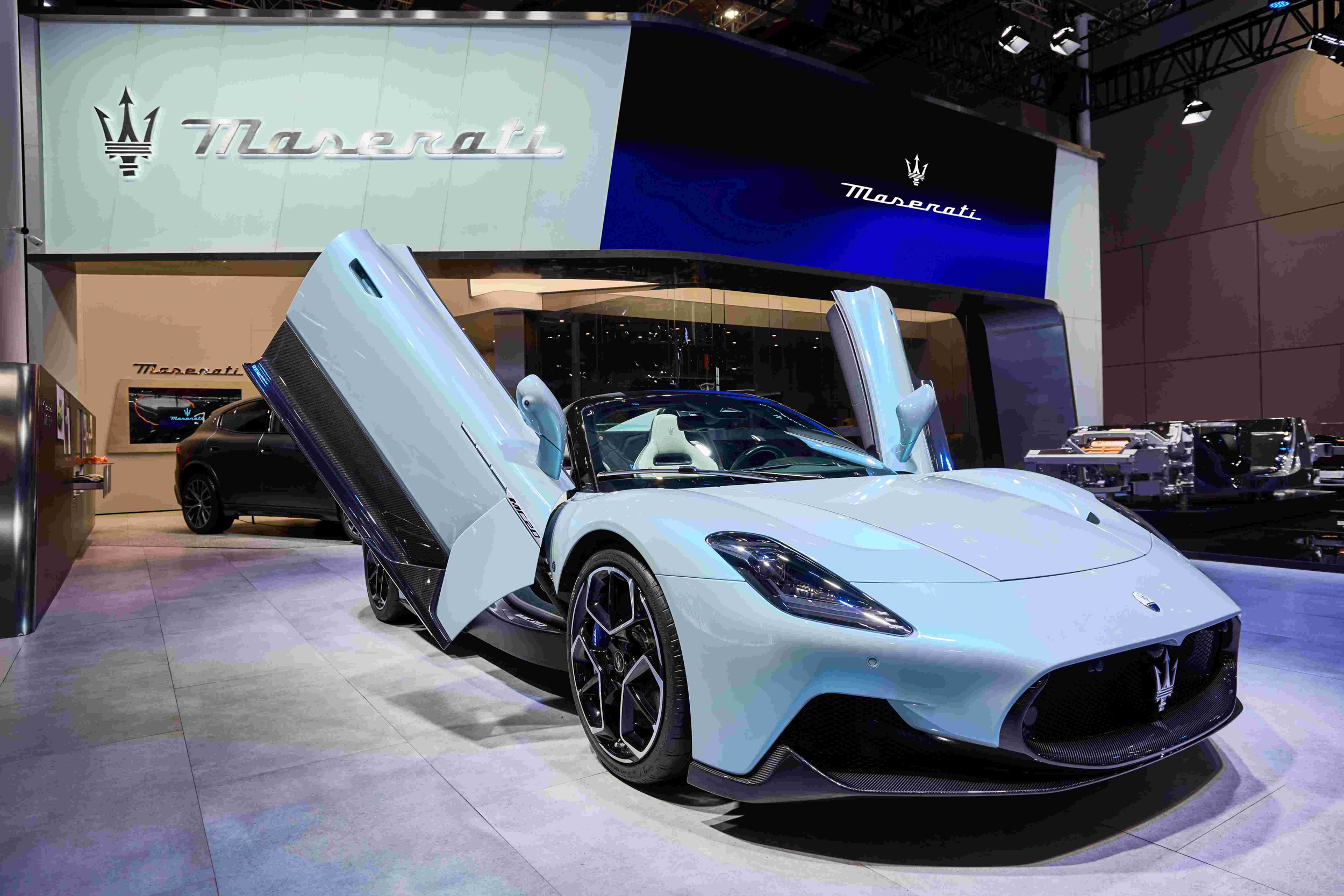 承載超跑靈魂的Maserati MC20 Cielo敞篷跑車,以「Sky Feeling天際之境 」之姿傲然屹立於展示台上,專屬碧海藍(Acquamarina)塗裝彷彿蘊藏大海和海浪下的狂野能量。這款跑車同樣搭載了Nettuno海神引擎,擁有630匹馬力的強勁輸出,最高車速可輕鬆超過320 km/h,賦予車輛貼地飛馳之感。與此同時,其極富創新性的電動玻璃硬頂,僅需12秒即可完成開啟或關閉,並可在時速50 km/h的車速下從容操作,結合先進的聚合物分散液晶(PDLC)技術還可一鍵將深色頂蓬切換至透明模式,帶來前所未有的沉浸式駕駛樂趣。