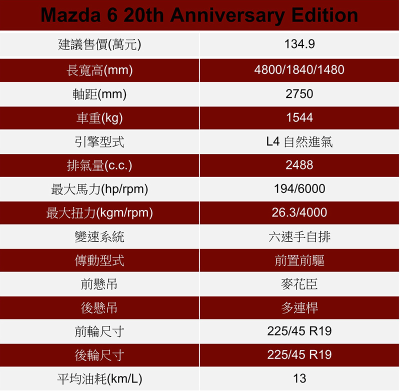 Mazda 6問世以來已邁入20年,為慶祝20周年推出Mazda 6 20th Anniversary Edition,該車型以Wagon 25S Signature車型為基礎,為顯其獨特身分Mazda 6 20th Anniversary Edition於外觀配置高光澤水箱護罩,進而帶來明亮且顯尊貴的車頭視覺。另外於車漆部分亦導入匠塗工藝Takuminuri新色匠韻紅,以往魂動紅於光線照射下帶來充滿質感的光影,而匠韻紅在三層基本塗層結構上加入黑色塗料,如紅寶石般的暗紅色光澤創造出更強烈深邃及精緻的光影對比,而車側葉子板「20th ANNIVERSARY」銘牌更像說明著Mazda 6 20th Anniversary Edition為集20年淬鍊之大成。