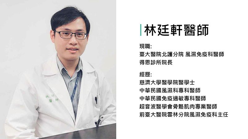 台大北護分院風濕免疫科暨得恩診所院長林廷軒醫師表示,「類風濕性關節炎」屬於全身性自體免疫疾病,因免疫系統失衡引起關節發炎和疼痛,未妥善治療恐導致關節破壞變形,也易引起心臟、肺部、眼部共病風險,好發於40~60歲的女性。根據研究指出,若家人患有類風濕性關節炎,發病風險為一般人的2至4倍,肥胖、吸菸也可能增加罹患類風濕性關節炎的機率。不同關節炎初期症狀常人難以分辨,若關節發炎疼痛持續6週以上或有「晨僵」症狀,應及早至風濕科檢查。林廷軒醫師進一步說明,發病後6個月內是黃金治療期,及早治療可避免關節破壞,病患應積極與醫師反饋症狀改善狀況、討論自身用藥,除了傳統類固醇與免疫調節藥物外,若發炎狀況未能緩解,現在也有許多生物製劑與小分子藥物可供選擇,透過阻斷第六介白素(IL-6)或腫瘤壞死因子來控制發炎、有效修復受損關節、減緩骨質流失速度,對於同時需服用多種藥物的患者來說,也可以單獨或合併一線藥物的使用,避免因用藥不規則而導致病情惡化。林廷軒醫師解釋,若關節出現對稱性腫脹、疼痛或僵硬等疑似類風濕性關節炎的初期表現,可先至專科診所進行詳細檢查,透過血液檢驗、X光攝影、關節超音波,即時了解自身發炎指數及關節損傷情況,除了減少在醫院各科求診、檢查所耗費的時間成本,保有良好的就醫品質,更把握患病初期的黃金治療期。