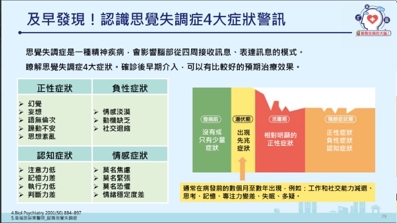 研究顯示,病友因缺乏病識感,首次發病後平均將近1年半才就醫,耽誤搶救大腦功能的時機。當民眾出現工作和社交能力減退、思考、記憶、專注力變差、失眠、多疑、甚至幻覺、妄想時,需盡早就醫診斷。