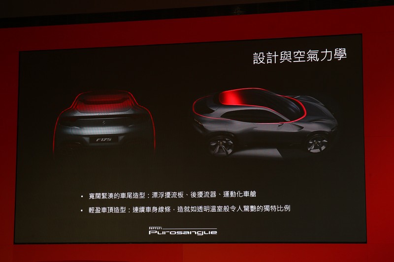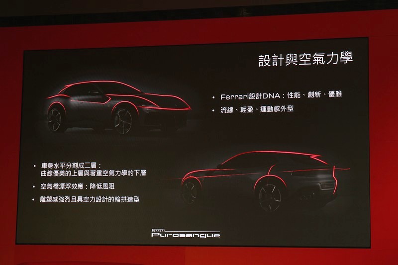在設計上,法拉利設計師們從零開始設計車身架構,其全新車架配置了碳纖維材質車頂,達到減輕重量並降低重心的目標。其中一大創新的設計亮點為引入後鉸鍊式後門,又稱作「歡迎門」,此設計提供新車在維持緊湊車身比例的同時,讓乘客進出時更加輕鬆便捷。在新車座艙設計,配備了四個附有加熱功能的全電動座椅,可為四名成年人提供優異的支撐力及舒適的乘坐空間與體驗。在空間機能上,新車擁有法拉利史無前例的大容量後車廂容量,後排座椅更可折疊以進一步增加後車箱空間。而相較其他躍馬跑車,Ferrari Purosangue儘管擁有更高的駕駛位置,但其構造及設定與其他躍馬跑車並無區別,駕駛位置依然盡可能貼近地面,讓駕駛者能夠依然直觀的感受車輛的動態性能。此外,新車也標配豐富的舒適性配備,例如Burmester © 音響系統,以及從認證再生聚酯中提取的全新Alcantara®內飾材質等諸多可選配備。Ferrari Purosangue在性能、設計、駕馭樂趣及舒適性上,再次完美樹立同級距市場中四門四座跑車的全新標竿!