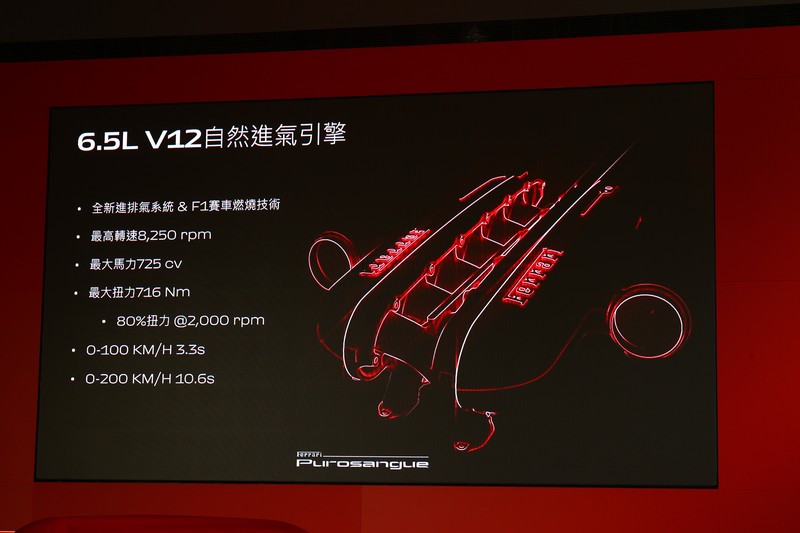 Ferrari Purosangue憑藉優異的性能、驚豔的設計及優異的駕乘舒適性在市場上獨樹一格,全新跑車作為品牌唯一採用此種創新設計比例並搭載前中置自然進氣V12引擎的車型,為Ferrari Purosangue帶來傲視同儕725 cv的強悍性能與令人沉醉的磅礡引擎聲浪。即使在低轉速情況下,引擎也能釋放80% 的峰值扭力,可說是在任何駕駛情境下皆可帶來獨一無二的駕駛樂趣。