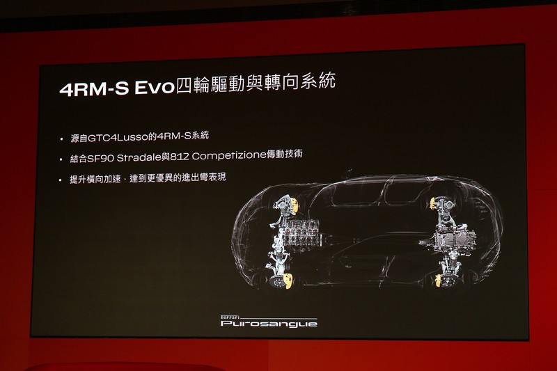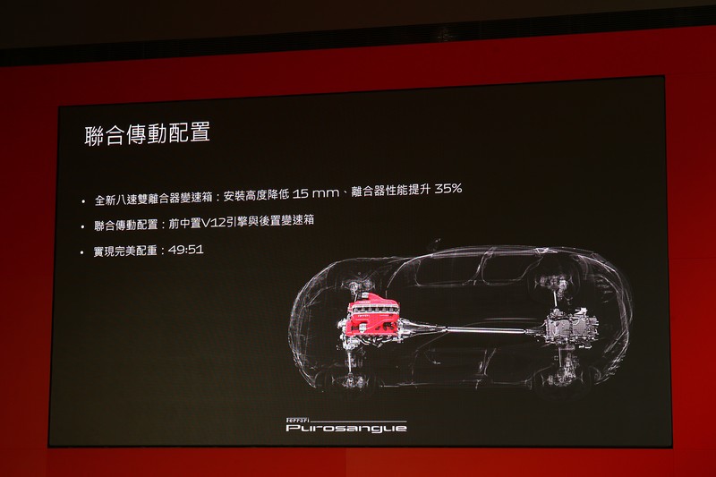 Ferrari Purosangue採用前中置引擎佈局與運動感十足的驅動橋結構,變速箱則放置於整車後半部。PTU動力傳輸單元位於引擎前方,成就了獨特的4x4變速箱配置。透過車身結構與所有零組件的搭配下,新車得以實現49:51 % 的重量分配,法拉利工程師們以專業的經驗相信這是採用前中置引擎跑車最完美的重量分配比例。