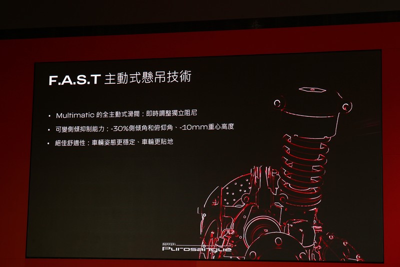 為了成就法拉利優異的操駕表現,法拉利將目前搭載於躍馬最強勁及稀有的運動型跑車上的全新動態控制系統應用至新車上,包括四輪獨立轉向系統及附帶6w-CDS的ABS Evo系統。此外,Ferrari Purosangue更搭載全世界首創的全新法拉利主動懸吊系統,此系統能即時有效地控制車輛過彎時的車身側傾以及高頻顛簸路況下的輪胎接地面積,完美達成與其他躍馬跑車同樣優異的極致性能表現和俐落的操控反應。