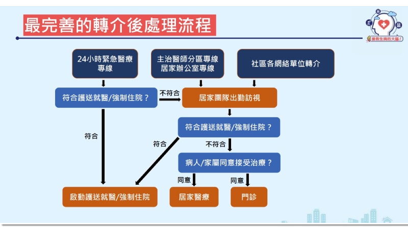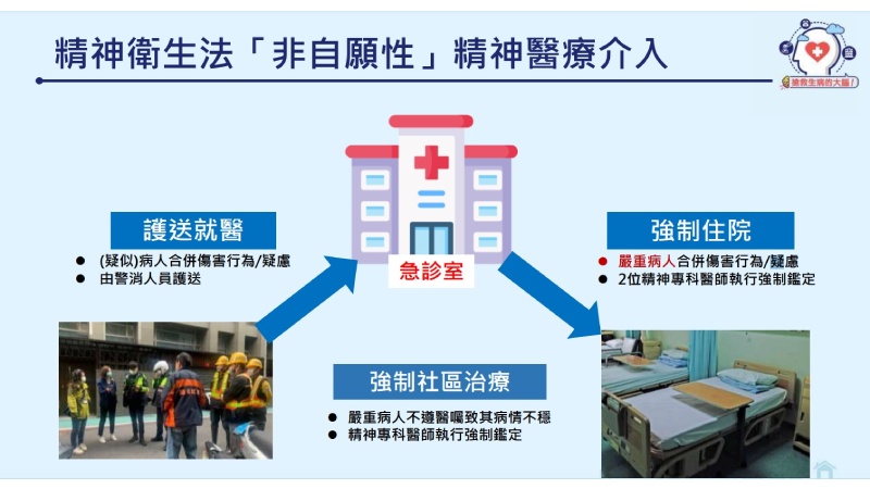 - 疑似精神病人且有自傷與傷人行為或之虞:由警消會同家屬護送至「指定強制就醫責任醫院」就醫。