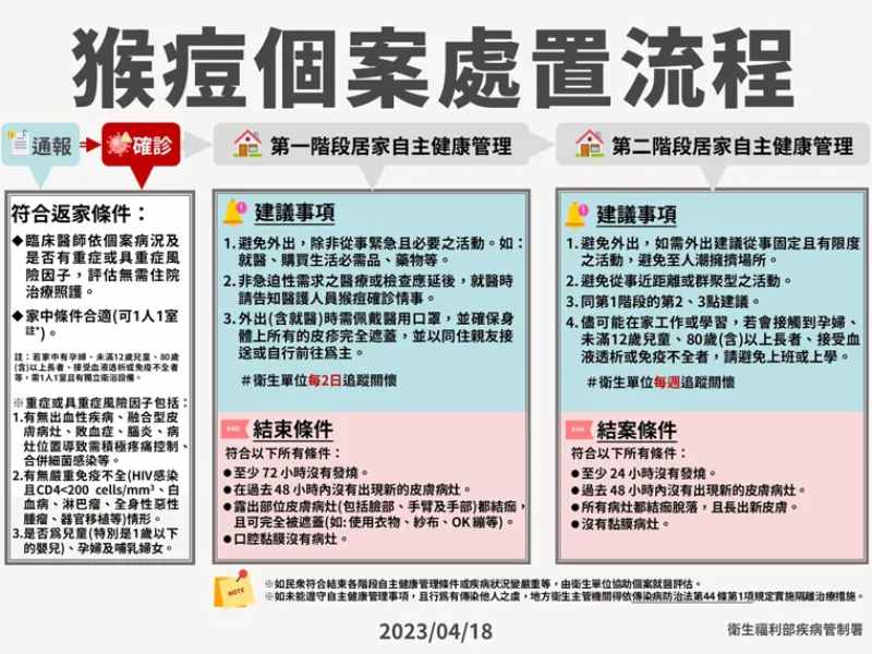 疾管署參考猴痘傳播力、侵襲率等相關國際文獻證據,以及國外猴痘確診個案之隔離政策與處置措施。考量猴痘傳播具侷限性,須長時間密切接觸或親密接觸才有較高傳播風險,一般日常生活、工作接觸等感染風險較低,因此依專家會議決議調整個案處置相關流程。民眾若為「疑似個案」,由臨床醫師依據其疾病狀況評估後,無重症或具重症風險因子、不需住院治療照護,且家中條件適合1人1室者,醫事人員會提供「疑似猴痘個案衛教事項」並通知地方衛生單位,民眾可返家等待檢驗結果,並需自主健康管理至檢驗結果陰性排除為止。