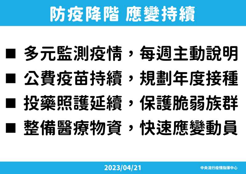 另外,疫苗也是民眾相當關心的一部份,指揮中心解編後仍有公費疫苗可繼續施打,疫苗EUA也不會因為指揮中心解編而受到影響,在EUA核准期限內合法製造或輸入產品,都可持續販售和使用到產品有效期限為止。