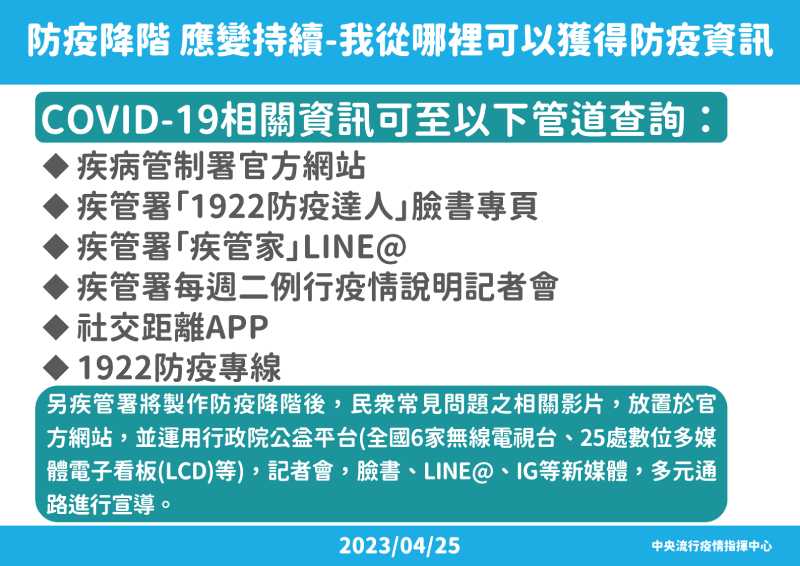 疾管署官網會設立「防疫降階 應變持續」專區,提供民眾查詢相關資訊。指揮中心也整理了防疫資訊6大管道,民眾可至以下管道獲得防疫資訊:- 疾病管制署官方網站
