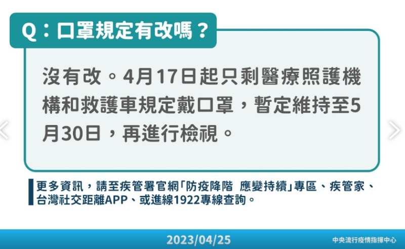 - 醫療照護機構/救護車口罩規定延續至5月30日