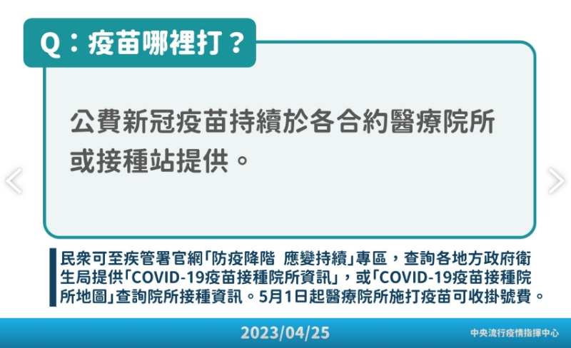 因此,公費新冠疫苗也會持續於地方政府提供的各合約醫療院所或接種站進行接種服務。莊人祥提到,疾管署官網「防疫降階 應變持續」專區也會提供各地方政府的接種疫苗院所資訊讓民眾參考。