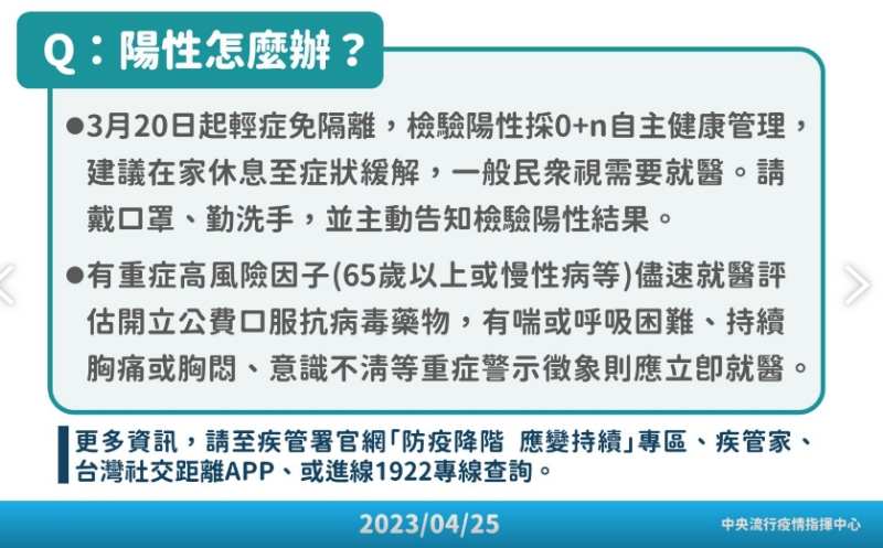 他也提醒,確診者應勤洗手、戴口罩,前往就醫時主動告知檢驗陽性的結果,有重症高風險因子(如:65歲以上、有慢性病、孕產婦等)請盡速就醫評估是否需要開立公費口服抗病毒藥物,如果有警示徵兆,也須立即就醫。