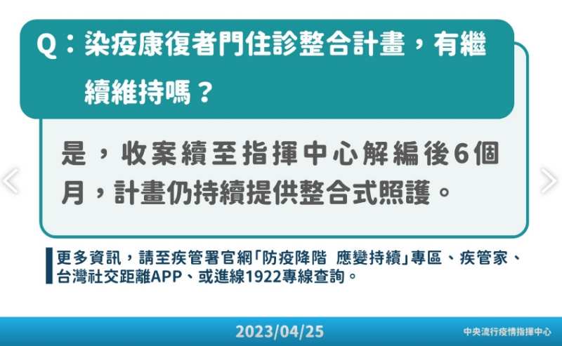 而目前針對染疫康復者,也有染疫康復者門住診以因應長新冠問題。但指揮中心解編後,染疫康復者門住診整合計畫還會繼續維持嗎?