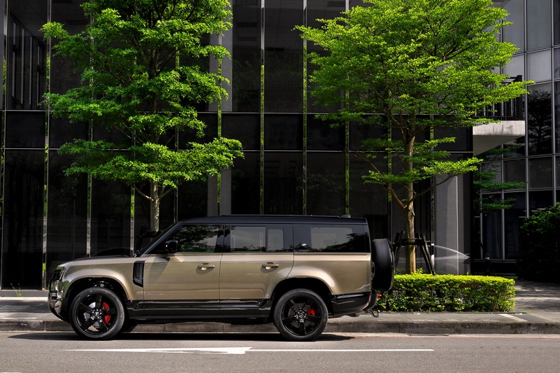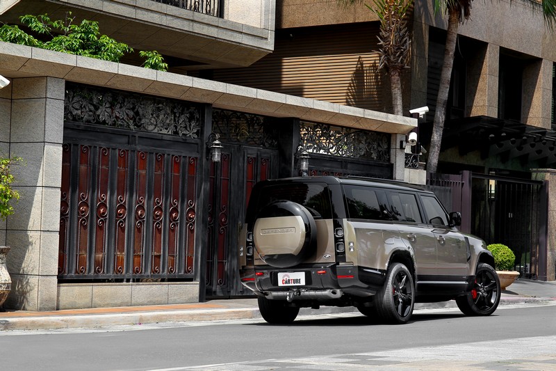 Defender 130 X P400引擎蓋、車頂與車頂架皆採用亮黑色配置,試駕車型還選配進階黑色外觀套件。