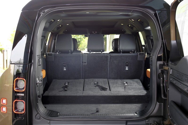 因X Defender車型所以拖車鉤拖車環等皆為標配。 130除了在外觀營造龐大氣勢,增長的尺碼最大受益就是車室空間,相較於110車型選配的第三排七人座,130車型則是標配八人座設定。雖軸距一樣為3,022mm,但受惠於5,358mm車長成人坐進第三排膝部依舊保有餘裕空間,方正的車身線條加上第三排配有天窗,因此頭部空間也相當充裕不會感到壓迫。通常這類三排SUV車型進出第三排空間不會太過寬敞,而Defender離地高度又來得更高,因此建議第三排還是留給年輕或腳骨靈活的人乘坐。另外雖說採八人座配置,但第三排中間座墊並不算寬闊加上受輪拱影響,因此建議兩人乘坐會較為舒適。