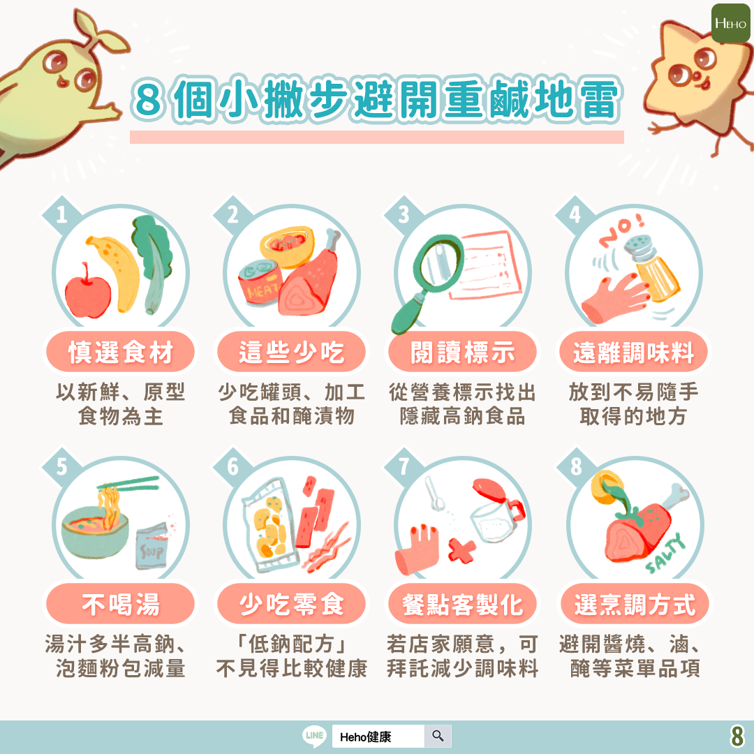- 選擇烹調方式:點餐時少選菜單上名稱有醃、滷、醬燒、燻等字眼,建議選擇烤、蒸、燉等烹調方式。