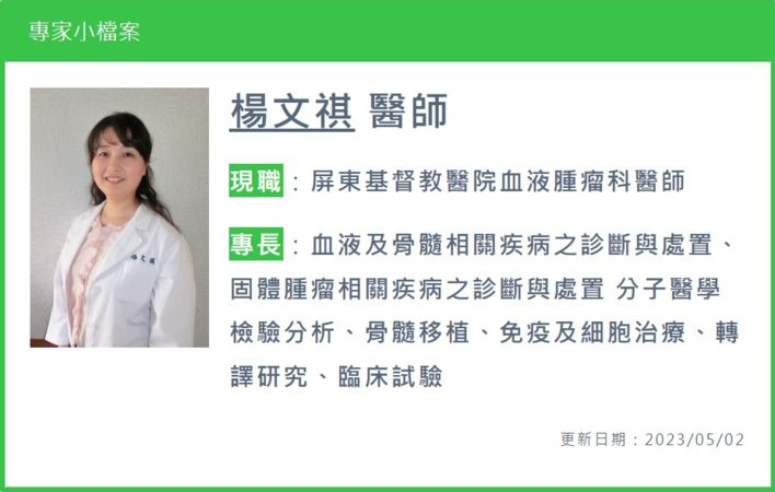 臨床治療上,骨髓增生性腫瘤病友大致區分為低風險與高風險,低風險者主要是依病友情況給予不同的治療,例如補充維他命B12、鐵劑、放血或輸血等改善症狀,高風險者則透過傳統口服藥、JAK2抑制劑標靶藥物或長效型干擾素來控制血球數量,除此之外,楊文祺醫師也提醒,有近2- 4%病友容易發生血栓,因此要特別注意預防血栓的發生,規律用藥,千萬不要自行停藥,而補血補氣的中藥類,尤其人參、當歸,不建議攝取,薑黃會抑制血小板,因此若是血小板低下的病友則避免過度攝取薑黃。