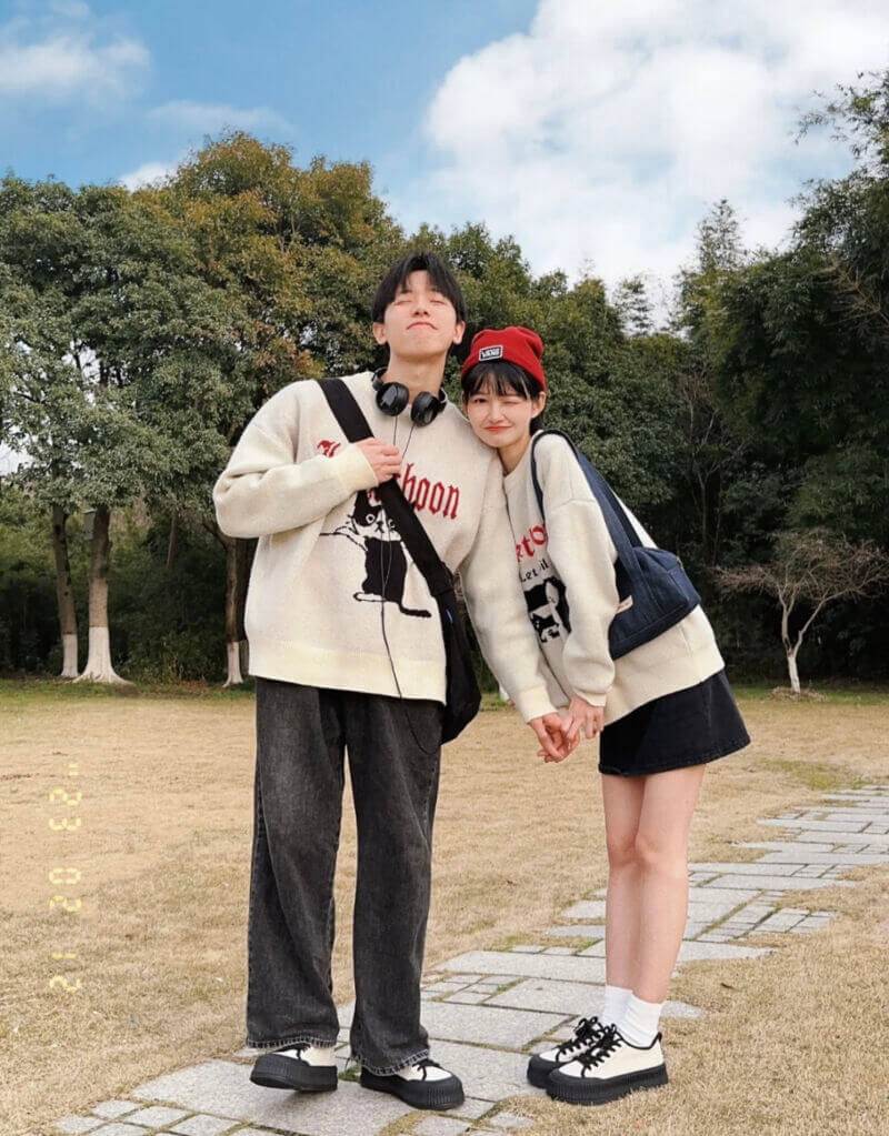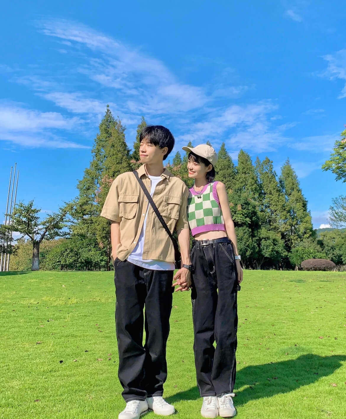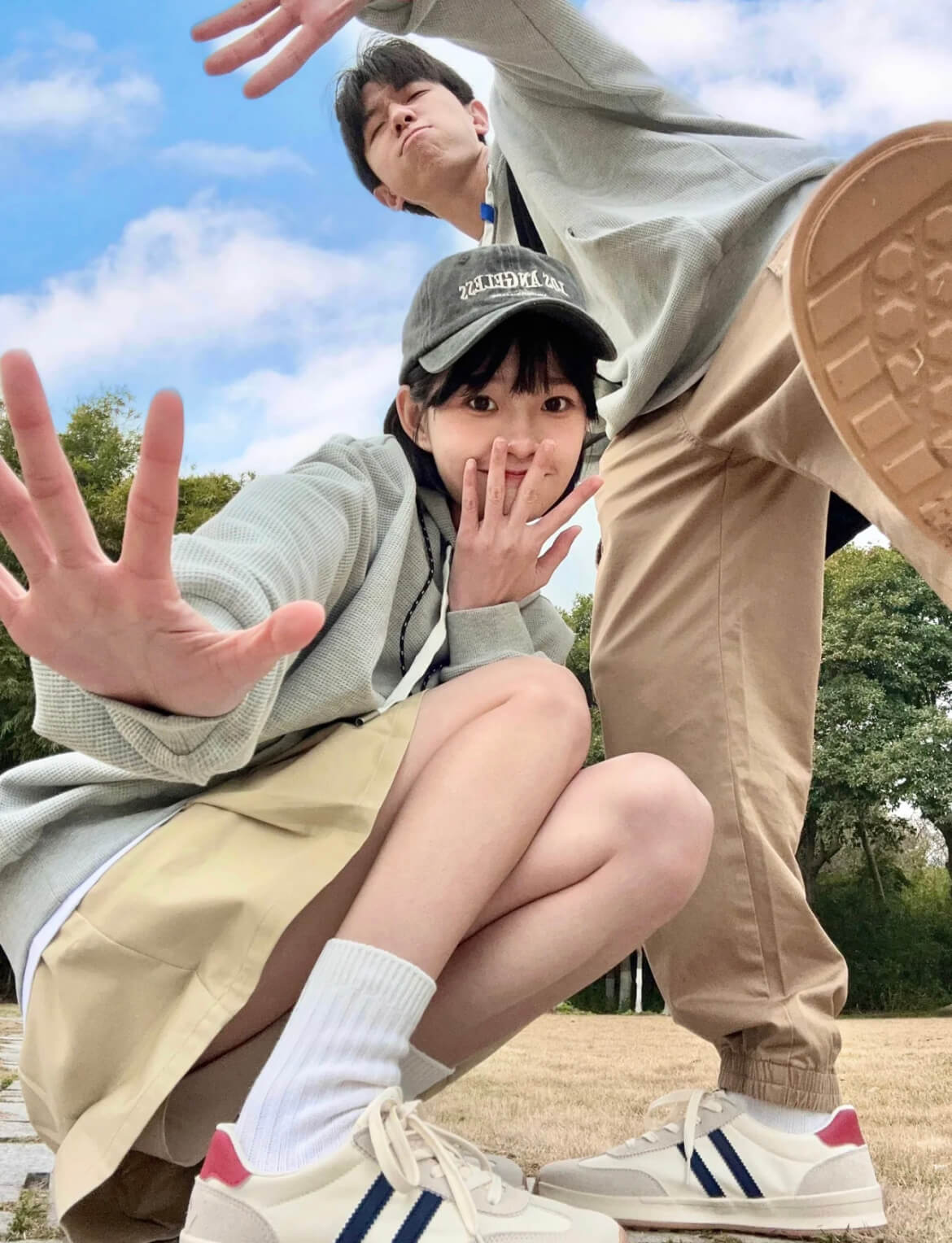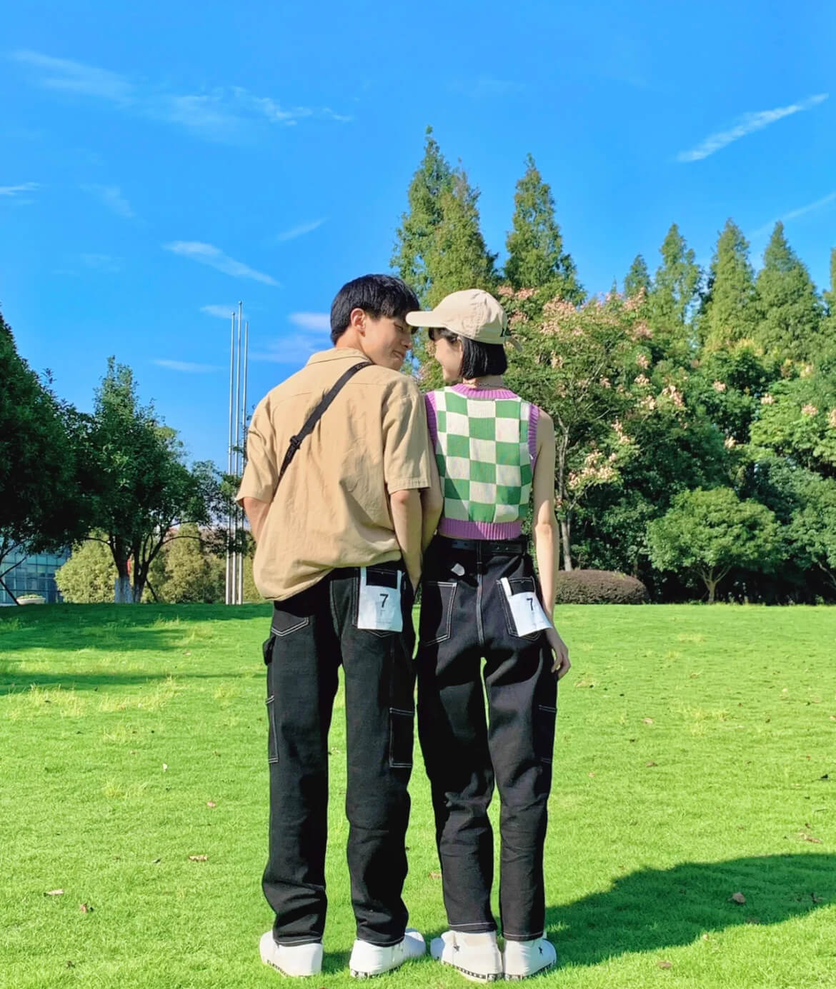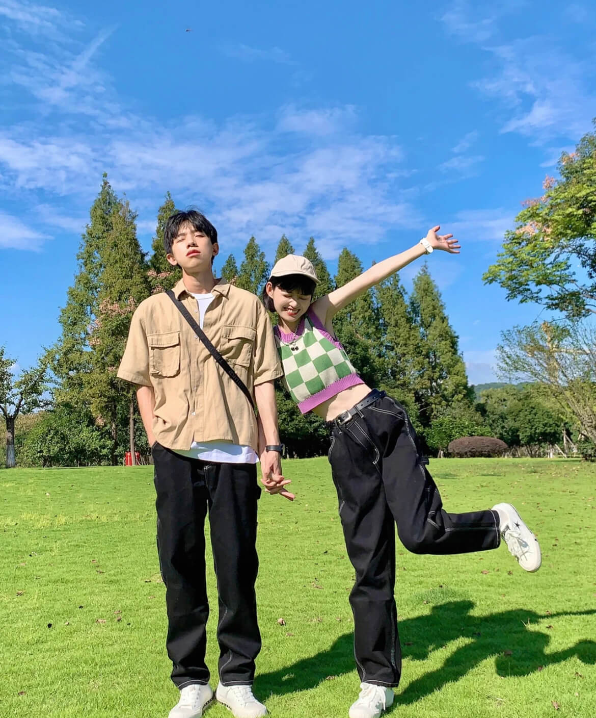 最後一招情侶合照的姿勢比較特別一點點,首先要先將手機放在地上,鏡頭微微向上傾斜45度左右,然後你跟男友可以一個人蹲下,一個人站著,再擺出自然的手勢,這樣除了可以用仰拍的角度增加構圖的豐富性,也能讓你們的合照變得更特別,推薦給想嘗試更有挑戰性情侶合照的你。