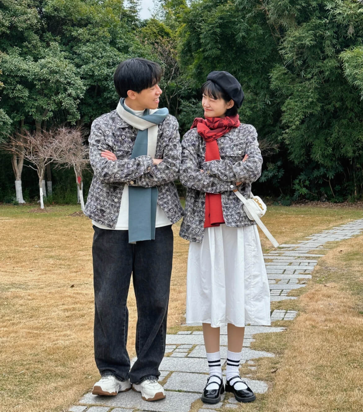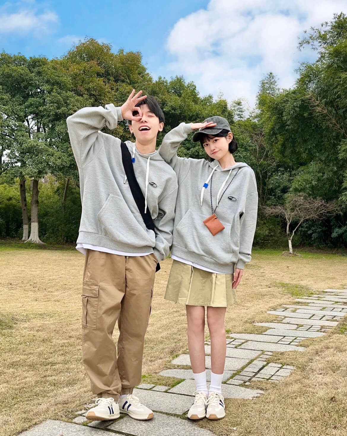 這個合照姿勢可以算是互相對看的變化版,訣竅是兩個人的站姿要越相似越好,然後一起向同一個方向看過去,不怕露出尷尬笑又能讓合照變得自然且帶點時尚感,非常適合看到鏡頭就容易變成木頭人的情侶們。