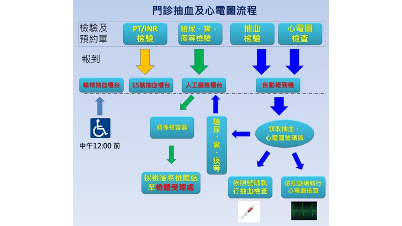 ▲台大醫院檢驗醫學部門診抽血及心電圖檢查流程。