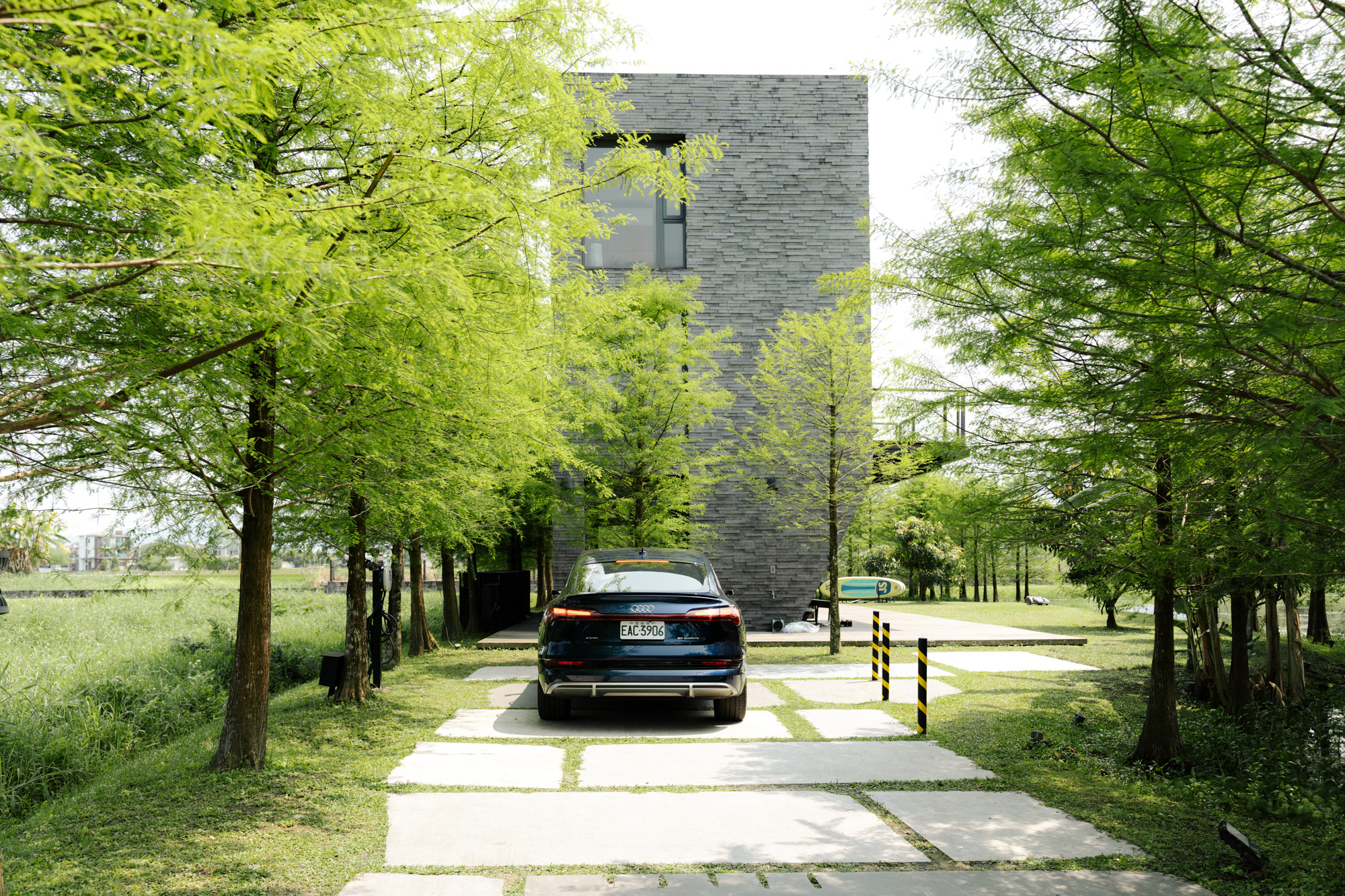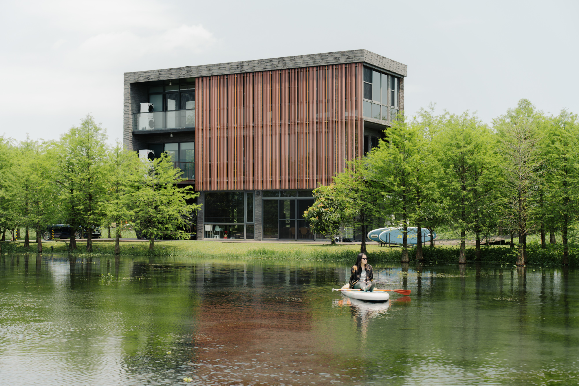 HA House 生活別墅系列作品中, 「春」大片透明落地窗,將戶外一片嫩綠框成一幅畫;「夏」遠眺龜山島的寬敞陽台,收進所有歡樂夏天的氣息;「秋」走出家門便能擁抱整排落羽松前的大片天然湧泉,隨時都能和家人一起在清澈池水暢玩SUP,讓人不禁期待接下來的「冬」、「山」主題會有哪些有趣的設計。