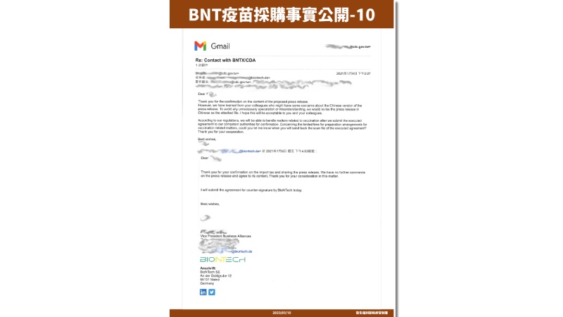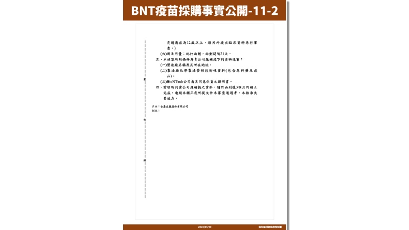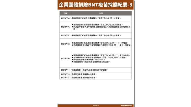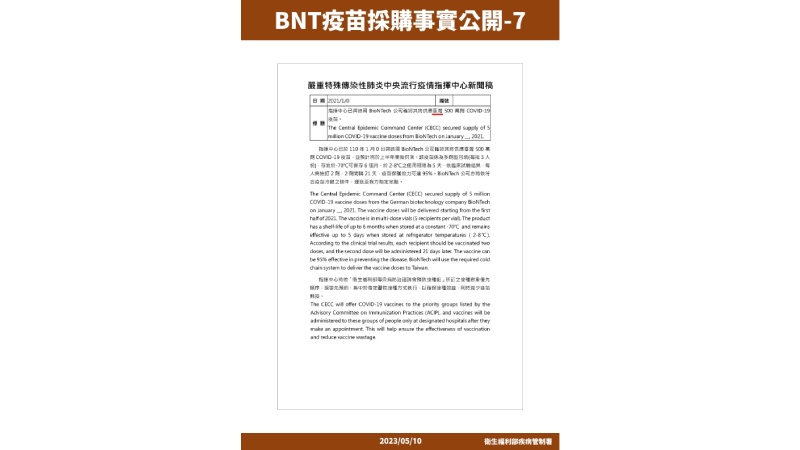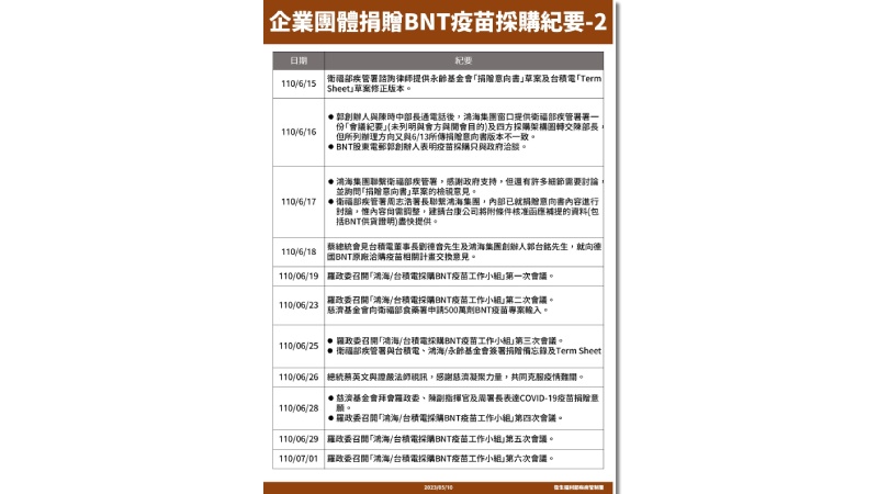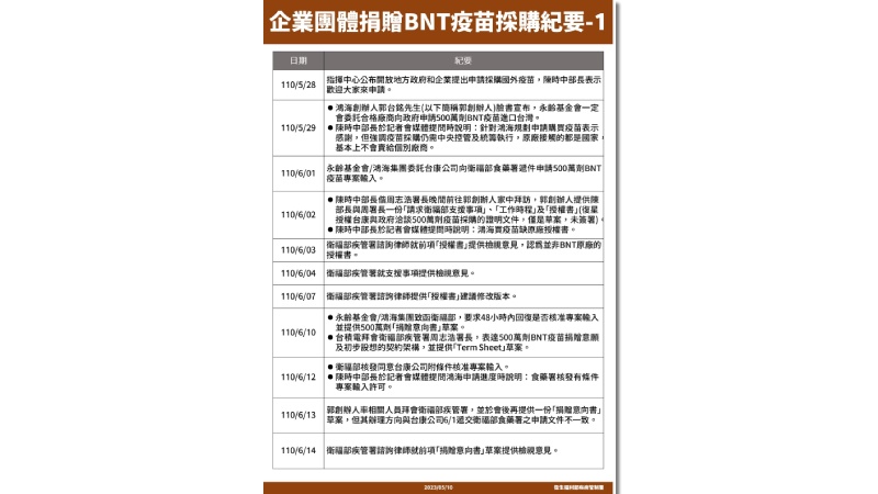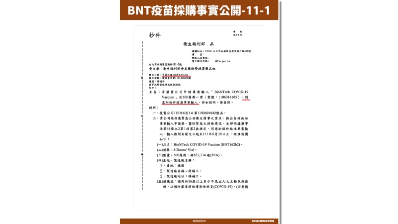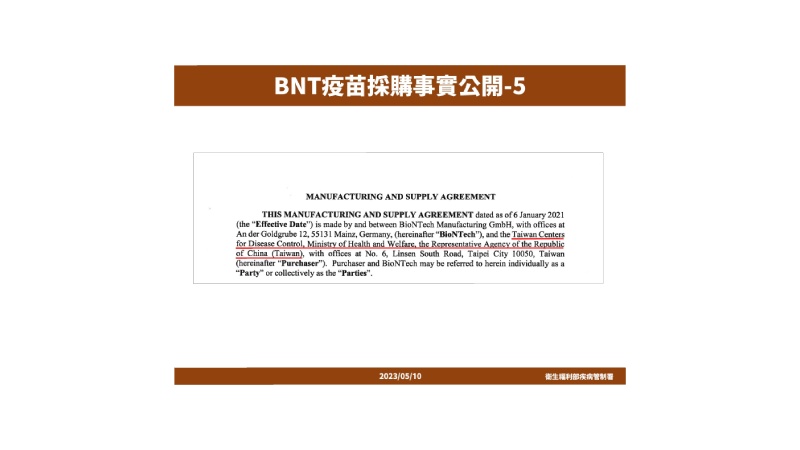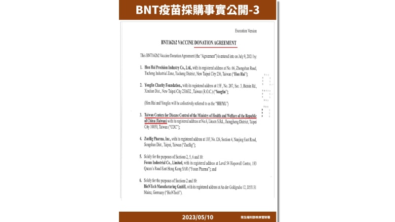 【健康醫療網/記者鄭宜芬報導】鴻海集團創辦人郭台銘辦公室9日聲明指出,政府與德國BNT公司的採購合約遭取消是因政府堅持名稱所致。衛生福利部10日上午召開記者會,次長周志浩還原2021年5月BNT疫苗採購的工作時程,也公布3份企業捐贈文件與1份政府採購案未簽成的文件,強調合約所使用的名稱BNT都無任何意見,而是在中文新聞稿中出現「我國」兩字,衛福部隨即做出調整,但未再收到BNT回信,採購疫苗無疾而終。