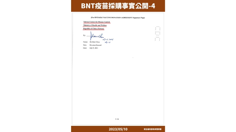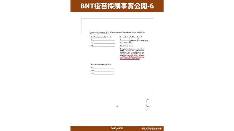 周志浩說明,6月簽署的意向書是代表Taiwan Centers for Disease Control, Ministry of Health and Welfare, the Representative Agency of the Republic of China (Taiwan)(衛生福利部疾病管制署),並沒有要求使用Independent Government of Taiwan(台灣獨立政府)等文字。當初跟BNT沒有簽成的合約,裡面清楚寫到,中華民國台灣衛福部疾病管制署,簽字部分為疾病管制署,是代表中華民國台灣衛福部簽署。