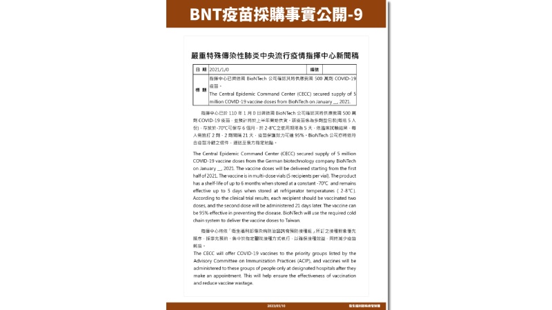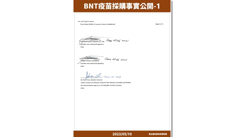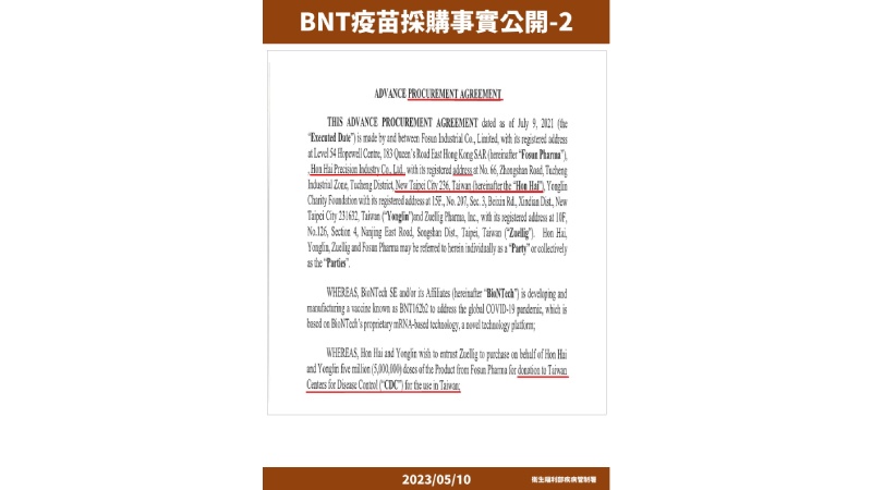 BNT疫苗採購案再次成為外界關注焦點,衛福部次長周志浩10日上午舉行記者會公開4份資料,包括企業捐贈意向書、企業採購合約、企業捐贈合約、疾管署和BNT未簽成的採購合約,以及與鴻海創辦人郭台銘洽談的完整時序。他表示感謝鴻海永齡基金會、台積電及慈濟的慷慨協助,自認採購疫苗沒有耽擱與拖延,也沒有使用獨立的台灣等字眼。周志浩說明,6月簽署的意向書是代表Taiwan Centers for Disease Control, Ministry of Health and Welfare, the Representative Agency of the Republic of China (Taiwan)(衛生福利部疾病管制署),並沒有要求使用Independent Government of Taiwan(台灣獨立政府)等文字。當初跟BNT沒有簽成的合約,裡面清楚寫到,中華民國台灣衛福部疾病管制署,簽字部分為疾病管制署,是代表中華民國台灣衛福部簽署。