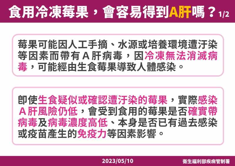 另外,今年共有32例本土A肝確定病例,目前也都無人曾食用本事件好市多相關冷凍莓果,不過疾管署會持續監測到6月底,並提醒民眾應注意A肝6大症狀。但民眾相當關心,食用冷凍莓果容易得到A肝嗎?對此,羅一鈞在記者會中分析說明。