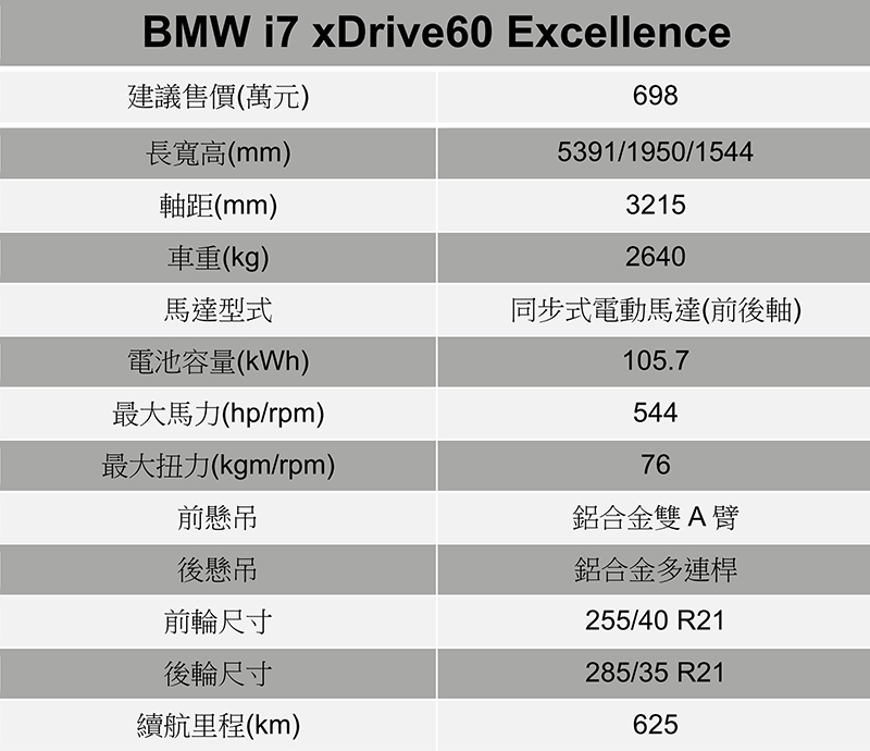 電子懸吊與前後軸自動水平氣壓式懸吊系統,提供幾乎無任何震動的行路感受。 i7 xDrive60與740i Excellence除動力與驅動系統不同外,配備部分則都有相同規劃,因此迎賓自動車門、12.3吋數位儀錶、14.9吋中控觸控螢幕、環繞光幕Individual Merino皮革加熱/通風座椅、Swarovski頂級水晶內裝套件、無線充電、自動變換車道、360度環景輔助攝影、AR擴增實境導航、遠端車輛啟動、記憶範圍達200m記憶路徑停車輔助、自動倒車輔助、17支揚聲器Bowers & Wilkins音響系統等全都有配備。