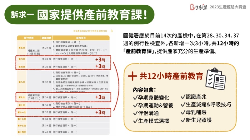 因此,生動盟建議國健署應該在目前14次的產檢中,在原訂要在第28、30、34、37週所做的例行性檢查之外,各新增一次3小時的產前教育,4次累積下來為12小時。