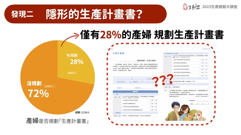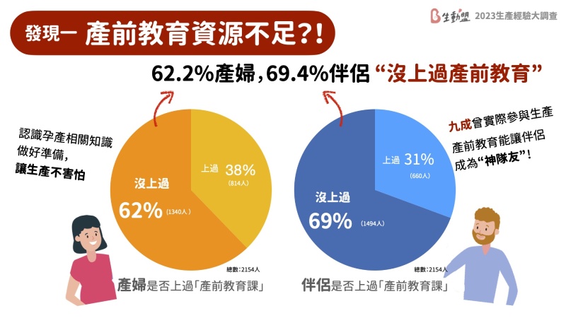 生動盟理事長徐書慧指出,高達九成的伴侶曾實際參與生產過程,卻多半沒有參與過產前教育。生動盟認為,除了醫療院所沒有提供相關課程,另一個原因是沒有合適的「假別」可以用。目前《性別工作平等法》提供孕產婦及配偶7天有薪產檢假,然而這些假別僅限用於陪產或產檢,無法運用在產前教育,要請假也難以證明。