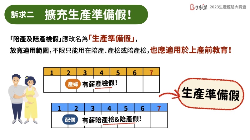 生動盟與婦女新知基金會皆呼籲,政府應將《性別工作平等法》第15條中的孕婦的「產檢假」以及孕婦伴侶的「陪產及陪產檢假」改名為「生產準備假」,同時放寬適用範圍,不限只能用在陪產、產檢或陪產檢,也能適用於參與產前教育。