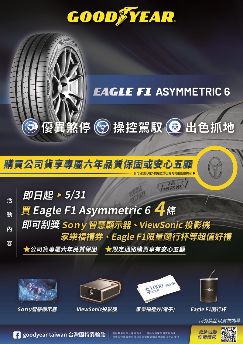 Eagle F1 Asymmetric 6限定刮獎活動介紹:https://www.goodyear.com.tw/news/f1a6-promotion