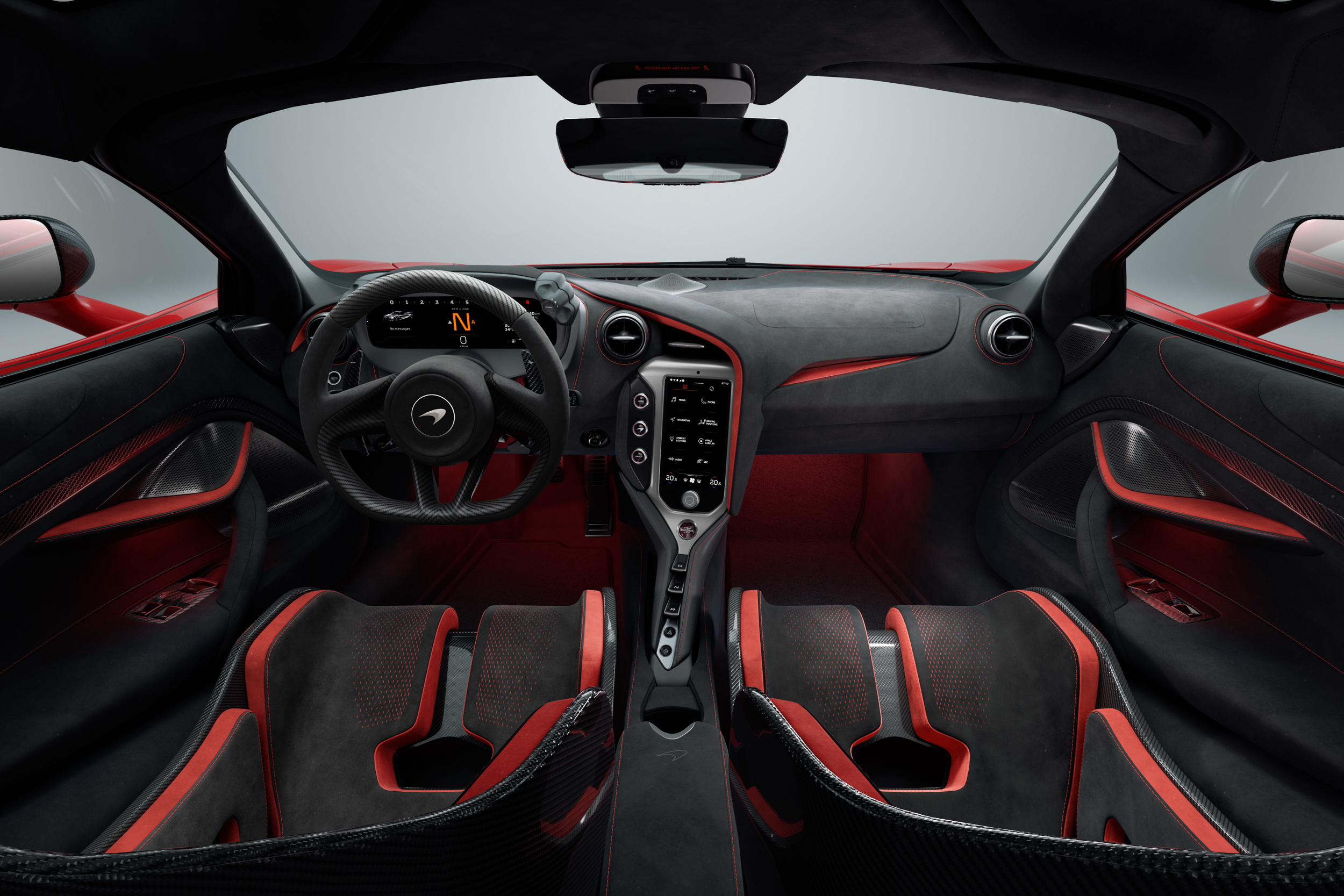 750S 內裝標配黑色Alcantara,另有Performance和TechLux兩種內飾主題,Performance純粹駕馭風格內裝使用Alcantara和Nappa皮革搭配,Techlux科技豪華風格內裝為全Nappa皮革,全車採用頂級音響品牌Bowers & Wilkins為750S開發的全新系統,配備強而有力的12支揚聲器,盡享McLaren獨有的聽覺饗宴。