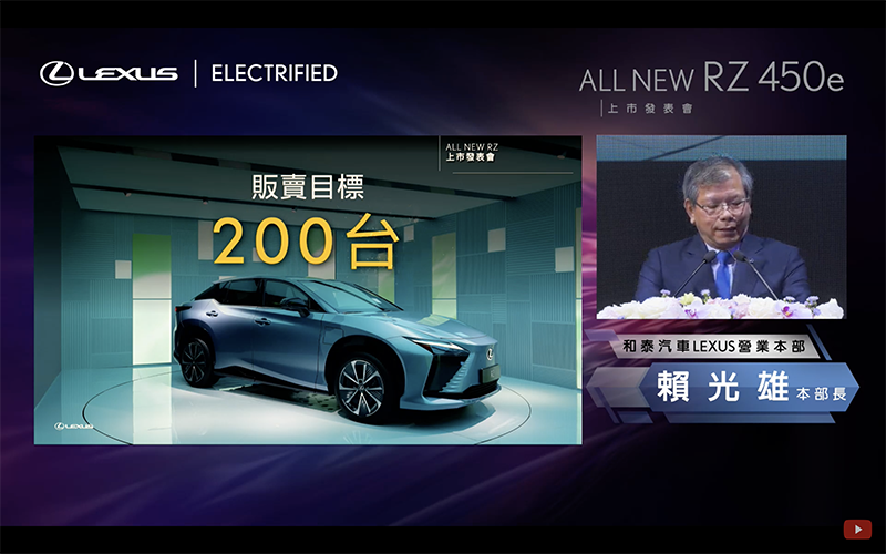 自今年3月於台北小巨蛋亮相,而4月於台北、台中、高雄接續巡迴舉辦城市試駕活動後,Lexus RZ 450e終於今日正式發表,並以單一車型279萬元的正式售價以及200台的年販目標,決心搶進方興未艾的豪華品牌電動休旅級距。